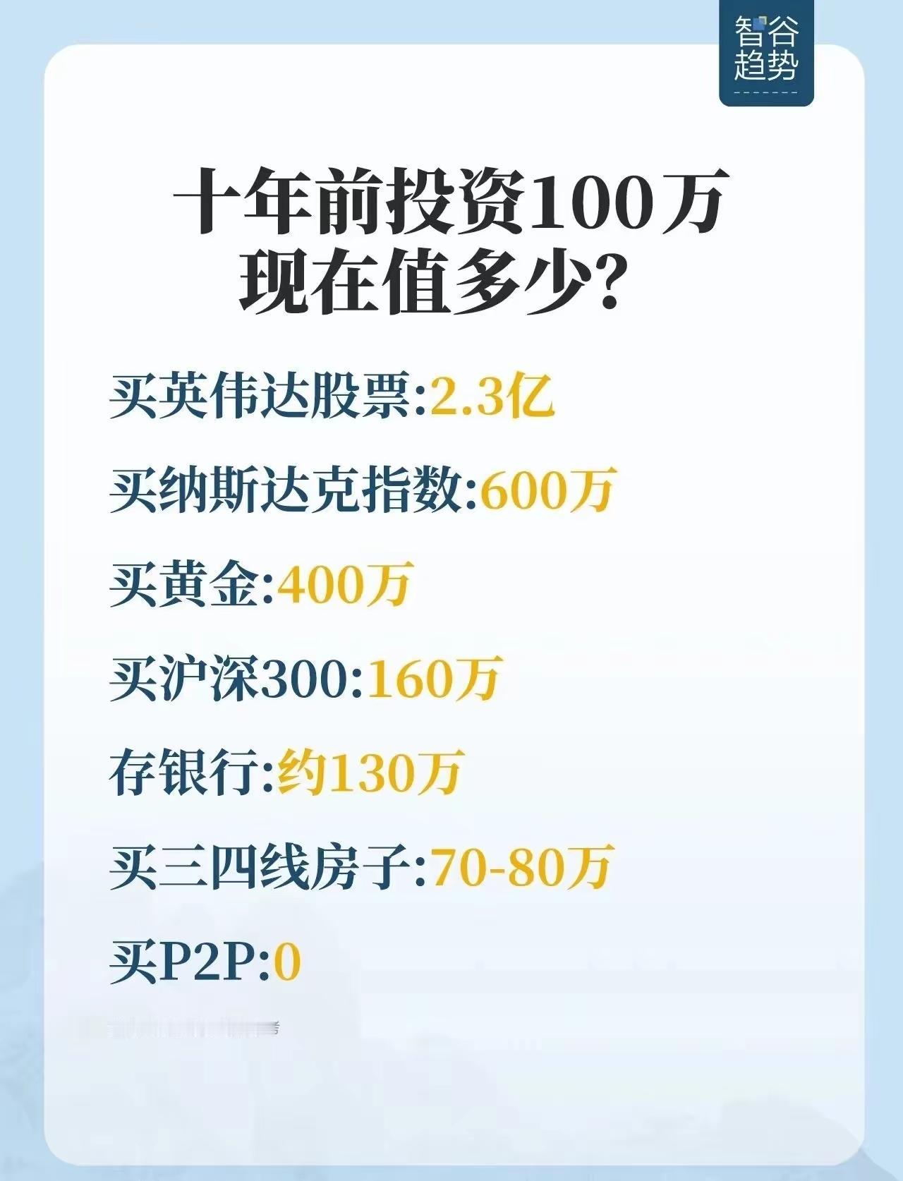 扎心对比!10年前100万,现在差出2.3亿! 家人们,看完这张图,我直接破防了! 同样是10年前的100万: - 买英伟达,现在值2.3亿,直接财富自由; - 买纳斯达克指数,变成600万,稳稳翻倍; - 买黄金,变成400万,跑赢通胀; - 存银行,只剩约130万,利息跑不赢通胀; - 买三四线房子,只剩七八十万,直接缩水; - 投P2P,直接归零,血本无归! 这就是选择的力量。 普通人别再死磕银行利息、瞎买房了,未来的机会,藏在指数基金、优质赛道和多元配置里。 不用赌妖股,定投宽基、跟上趋势,也能慢慢滚雪球。 ⚠️ 风险提示:不构成投资建议,市场有风险,投资需谨慎。 你10年前的钱,都投到哪了?评论区聊聊,点赞收藏,别再选错赛道! 投资 理财 普通人理财