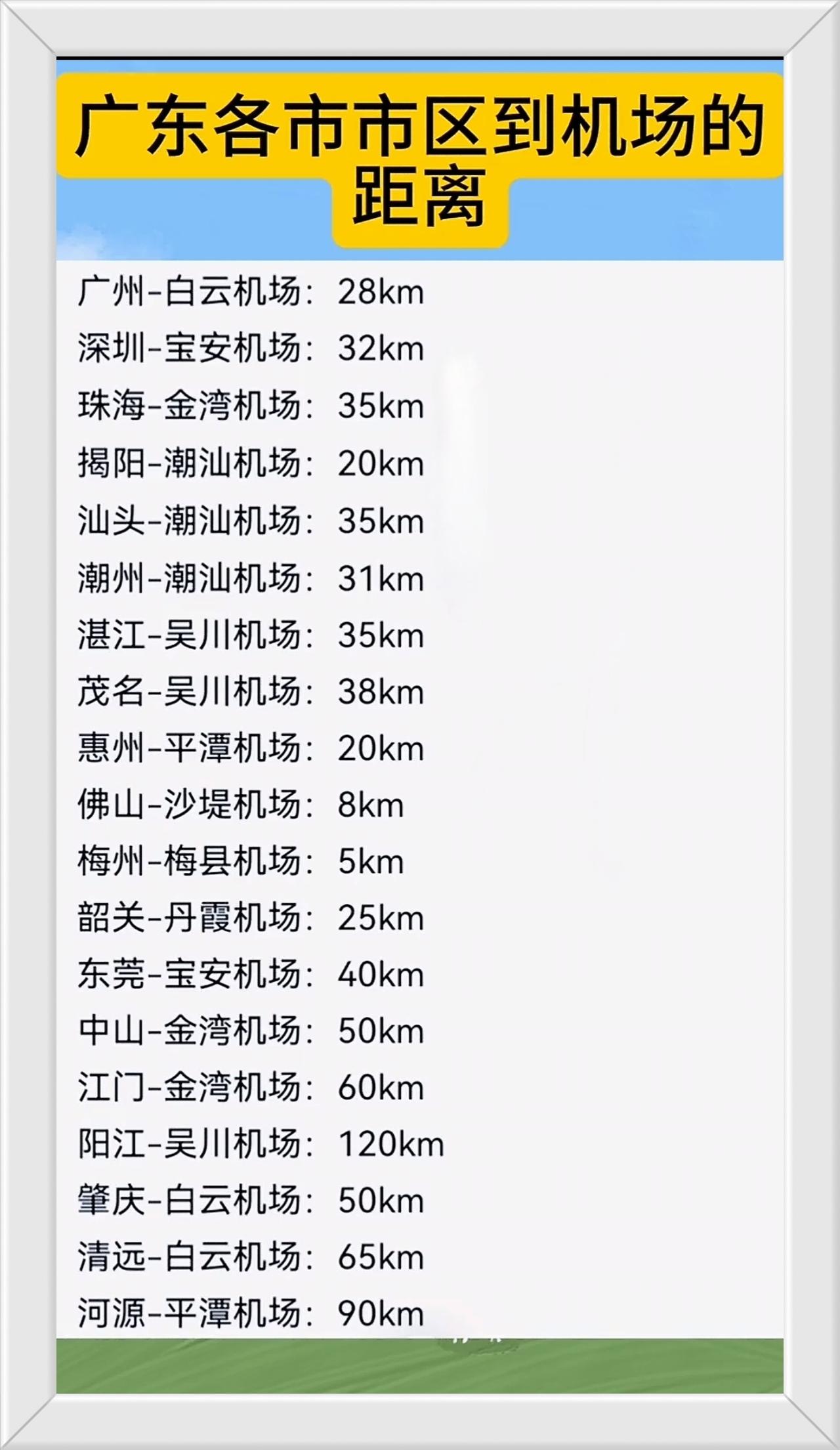 广东省21个地级市人民前往这九座大城市乘坐民航飞机的路程距离一览表。