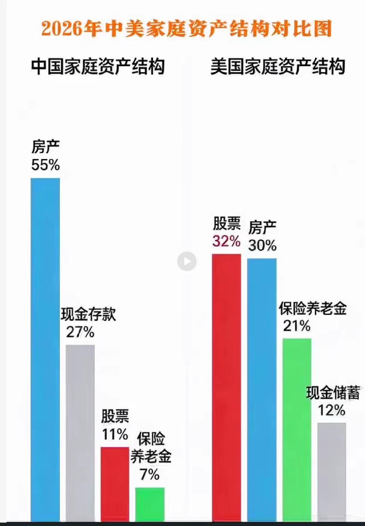 中美家庭资产对比,普通人的机会藏在这里! 中美家庭资产结构差得不是一点:中国家庭一半资产砸在房子里,美国则是把大头放在了股票和养老金上。 过去靠买房躺赢的时代过去了,现金存银行也跑不赢通胀。普通人的机会,恰恰藏在这场资产配置的迁移里。 从房产依赖转向多元配置,从现金躺平转向长期理财,把闲钱慢慢挪到指数基金、优质红利资产里,才是穿越周期的稳路。 ⚠️ 风险提示:不构成投资建议,理性配置资产。 你家资产里,房产和金融资产占比各是多少?评论区聊聊! 资产配置 理财