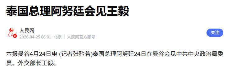 中国和泰国谈妥了 当地时间4月24日,泰国总理阿努廷在曼谷会见了中国外交部长王毅,双方就中泰两国的关系以及合作,还有共同关心的地区国际热点问题进行了交流,并达成了共识。 放眼整个东南亚,要说和我们相处最融洽、羁绊最深的邻居,泰国绝对排在前列。两国山水相望,常年往来密切,民间交往深入人心,双边关系一直保持着平稳向好的大趋势。 就在近日,一场关键的线下会晤在曼谷如期落地,为中泰未来的合作走向和地区稳定发展,定下了清晰的基调。 当地时间4 月 24 日,泰国总理阿努廷在曼谷正式迎来中方重要外事交流,双方围绕中泰双边关系深化、各领域务实合作推进,还有整个东南亚区域内多个备受关注的热点议题,进行了全面且深入的沟通交流。 整场沟通氛围务实平和,双方充分交换彼此想法与立场,直面当下区域发展遇到的各类问题,最终在多个核心领域形成统一认知,顺利达成多项共识。 很多人看国际新闻,总习惯盯着激烈的博弈和尖锐的冲突,觉得平静的双边会面没什么看点,其实恰恰相反,国与国之间心平气和的深度沟通,往往比短期的舆论交锋更有分量,也更能决定一片区域未来数年的发展走向。 尤其是在当下复杂的国际大环境里,东南亚早已不是一片安稳的净土,各类外部势力持续渗透,阵营对抗的风气不断蔓延,不少周边国家被迫陷入摇摆抉择的两难境地,这种背景之下,中泰之间的稳定对话,本身就是一种难得的定力。 一直以来,中泰的友好从来都不是停留在纸面的客套话术,而是实实在在融入普通人生活的双向奔赴。普通民众最直观的感受,就是畅通无阻的文旅往来,两地风土人情互补,出行往来便捷,长久以来形成了稳固的民间纽带。 产业层面的协作更是扎实落地,一方有着成熟的基建配套、完整的产业体系和广阔的消费市场,一方有着特色农业、旅游资源和区位优势,彼此取长补短,不用刻意捆绑,也不用强行依附,自然而然形成了互补共生的合作模式。 不同于部分国家反复摇摆的外交态度,泰国在区域交往中,一直保持着难得的理性与清醒。身处中南半岛核心位置,泰国很清楚自身的区位价值,也明白小国在大国博弈之中的生存法则。 盲目选边站队,卷入不必要的对立纷争,短期或许能换来口头承诺的红利,长远来看只会打乱自身发展节奏,拖累民生建设,让整个国家陷入被动。 这次曼谷会面,双方没有纠结于细枝末节的分歧,而是牢牢抓住合作与稳定两大核心。 从双边长期友好关系的持续巩固,到日常经贸、民生、文旅等领域的常态化协作升级,再到携手应对地区共同挑战,管控区域潜在风险,每一项共识都贴合双方的实际需求,也契合东南亚整体的发展诉求。 我们要清醒看到,最近这些年,总有域外力量把手伸进东南亚,想方设法制造隔阂与矛盾,四处拉拢区域国家组建小圈子,刻意渲染对立氛围,试图割裂区域内部的合作纽带。 这些势力从来不关心当地民众的生活好坏,不在意区域经济的复苏发展,唯一的目的就是搅动局势、制造分裂,借着地缘博弈谋取自身战略利益。 但越来越多的东南亚国家已经看清了这套套路,画出来的空头承诺无法落地,强加的对抗模式只会破坏安稳,真正能给国家带来发展、给百姓带来实惠的,永远是平等互利的合作、和平稳定的环境。这也是近些年,周边众多国家纷纷主动深化和我们交流合作的核心原因。 中国的周边交往逻辑始终简单且通透,从不干涉他国内政,不强迫别国选边站队,不搞霸权式捆绑,始终坚持尊重各国自主选择的发展道路,所有合作都建立在平等自愿、互利互惠的基础之上。 修路通商、互通有无、民生互助、资源共享,所有合作内容都看得见、摸得着,没有虚头巴脑的套路,这也是我们和周边国家能够长期维系良好关系的核心底气。
