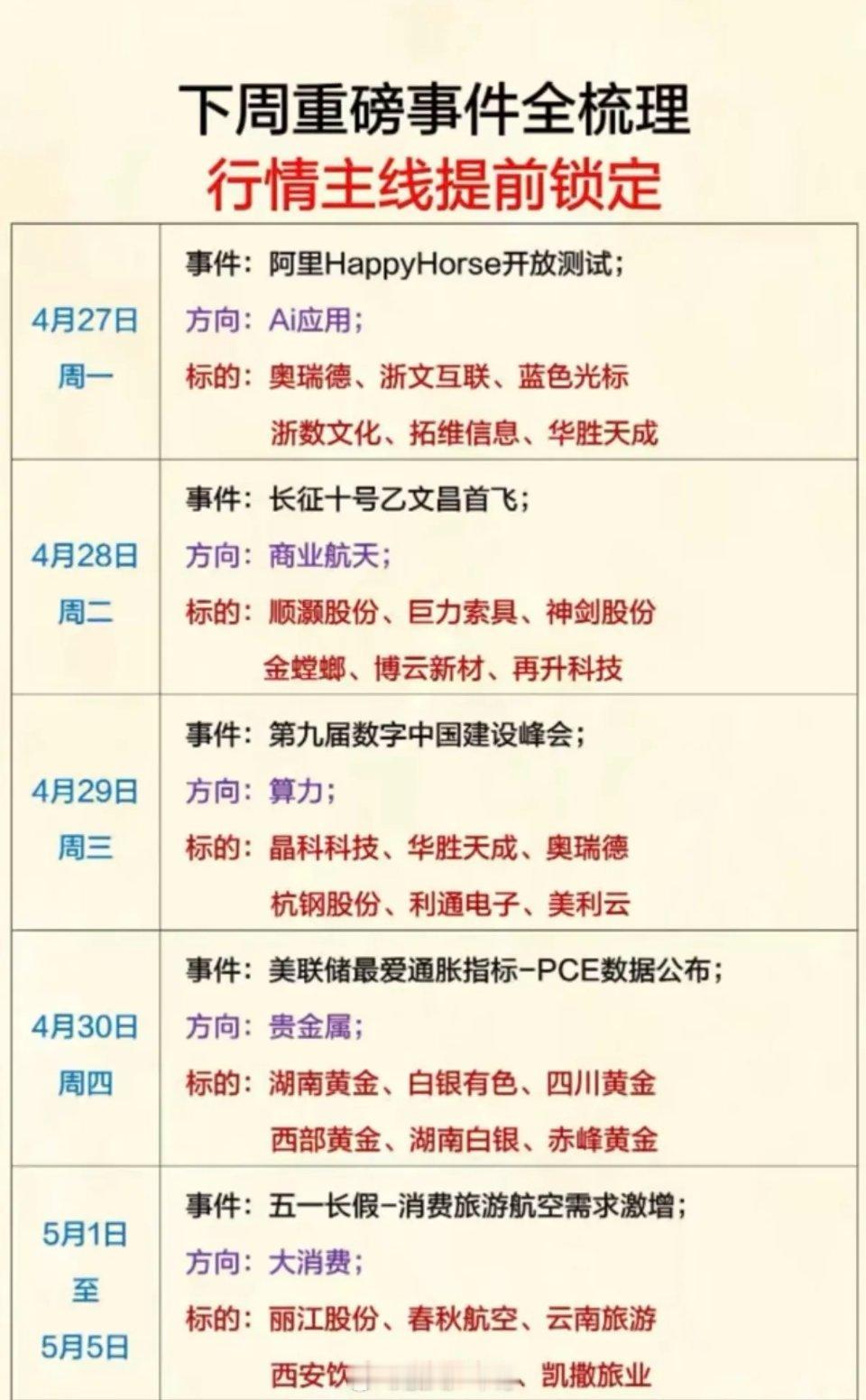 1.阿里HappyHorse开放测试2.长征十号,商业航天3.数字中国,算力4.贵金属5.五一长假:旅游,航空,大消费