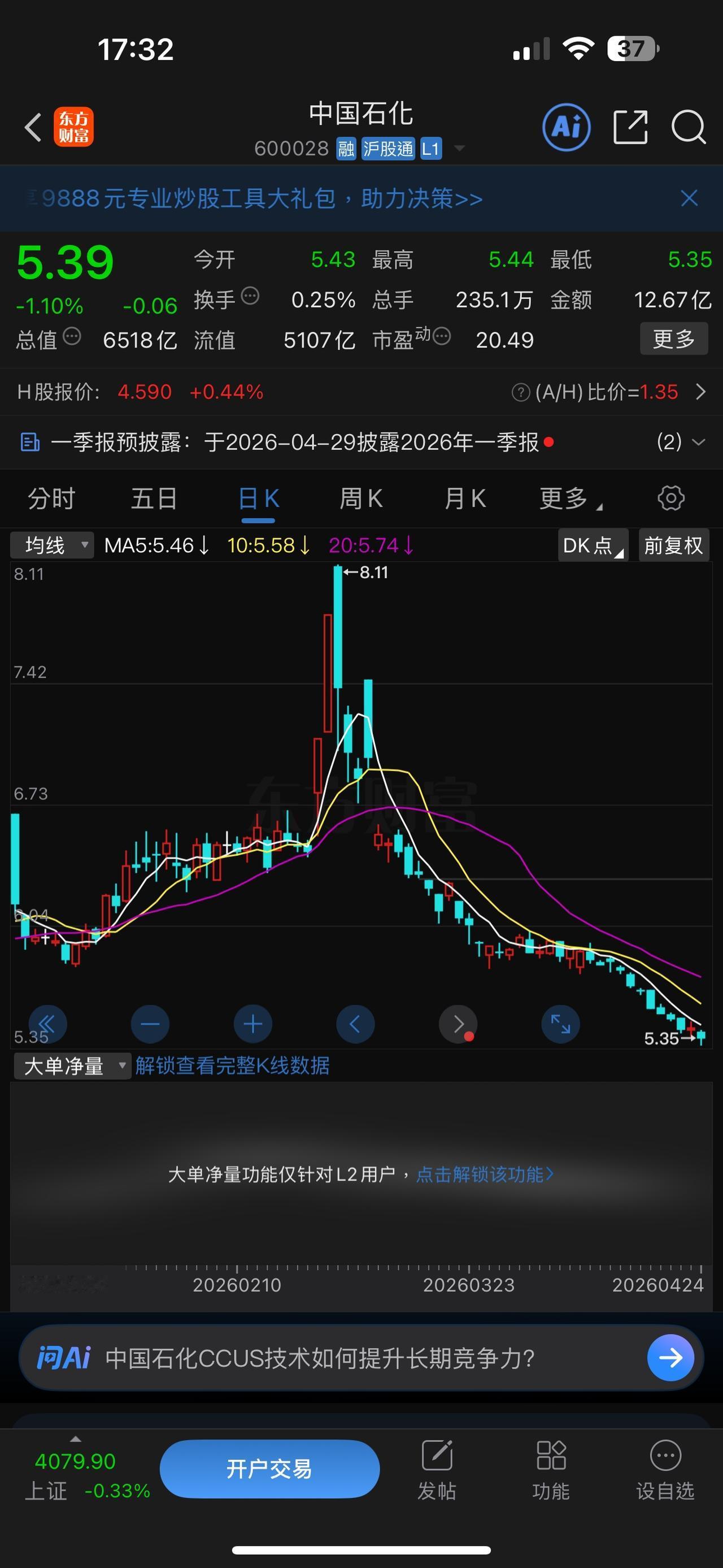 中石化,上个月初还在8.11元,这个月末,持有者正在担心:月底前会破5吗? 一个多月暴跌35 %,很多人已经补到弹尽粮绝。 很多人之所以越跌越补,就是看着大盘已经弹回4000点了,不信它会一直跌,还因为看着中石油、中海油并没有跌多少,也相信央企的实力,永不退市,大不了套死了拿股息……。 然而,看看最近这半个多月的诡异走势,以及23倍的盈率,再看看一大拨几倍盈率的央企不是也跌跌不休吗? 周五,纳斯达克再次猛烈上攻,大涨1.63 %,很多科技股再创新高,而道琼斯却是收绿。 想一下,最近场内资金的此消彼长,周一资金的走向,中石化估计又得下台阶了。