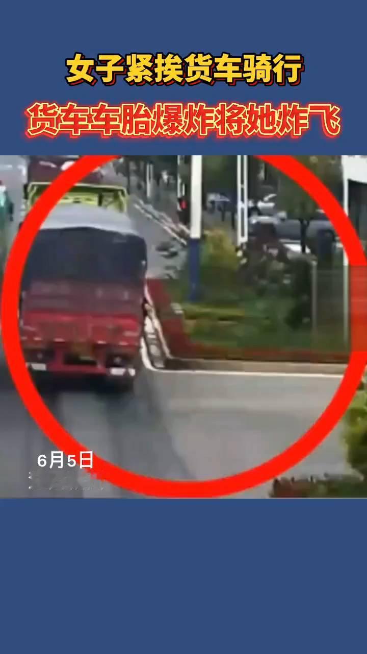 女子紧挨货车骑行,货车车胎爆炸将她炸飞。 6月5日江西赣州,女子在货车盲区骑行,货车轮胎碾压到电动车发生爆胎。交警认定货车司机未按操作规范安全驾驶,需承担事故的全部责任。受伤女子被及时送医,已无生命危险。