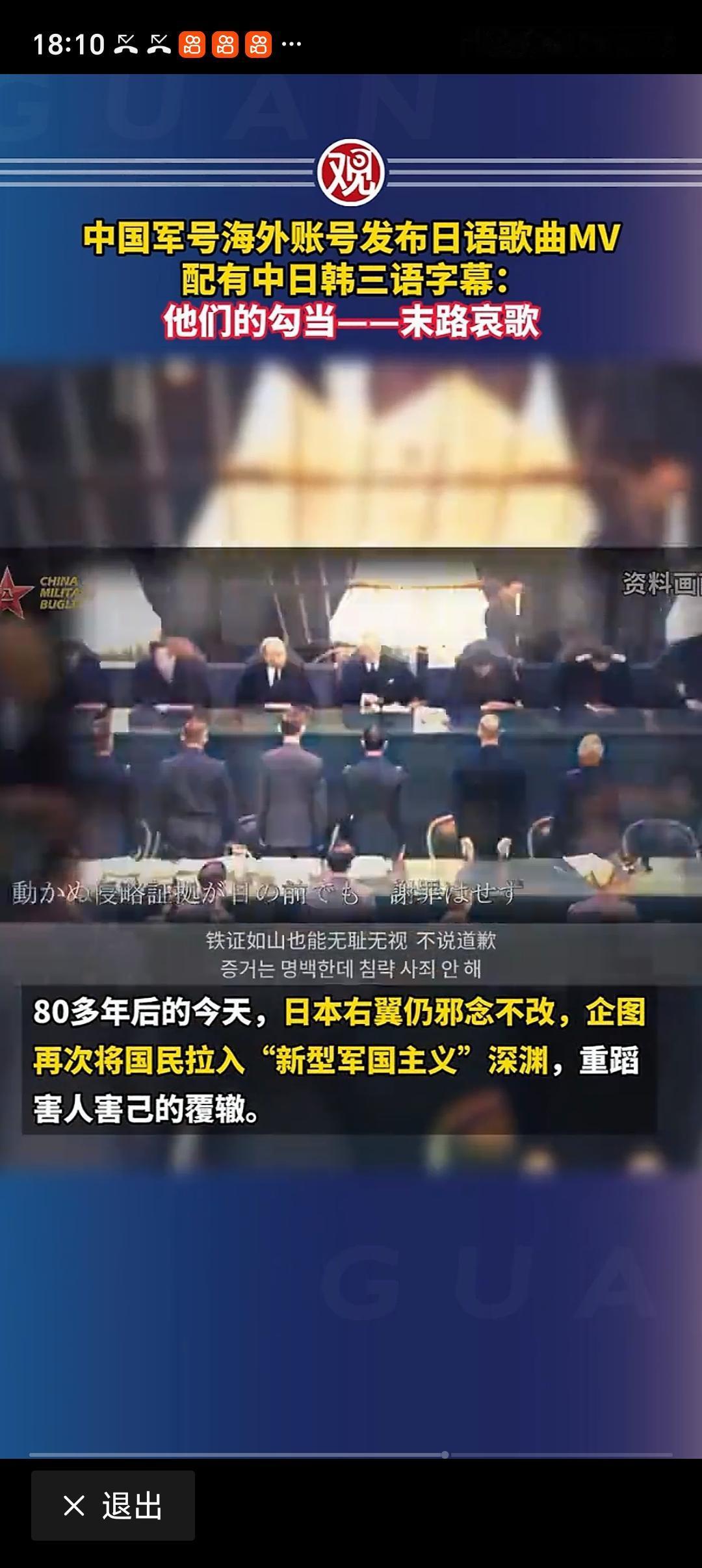 中国军号海外发布视频“末路哀歌” 2026年4月25日,解放军官方账号“中国军号”在海外平台发了日语MV《他们的勾当——末路哀歌》,这动静可不小。视频核心“邪路的尽头,唯深渊万丈”,针对的是日本右翼近期的危险动作,像自卫队人员持刀闯中国使馆、日舰过航台湾海峡、首相向靖国神社献祭品、修改“防卫装备转移三原则”等。 这可不是要开战或马上制裁,是军队级的公开警告。中国军号发声比外交表态威慑力更强,但和制裁不同,制裁是政府行为,军号视频是舆论亮剑。而且中国对日反制早就在进行,这次视频就是明确警告日本右翼,别再妄图复辟军国主义。