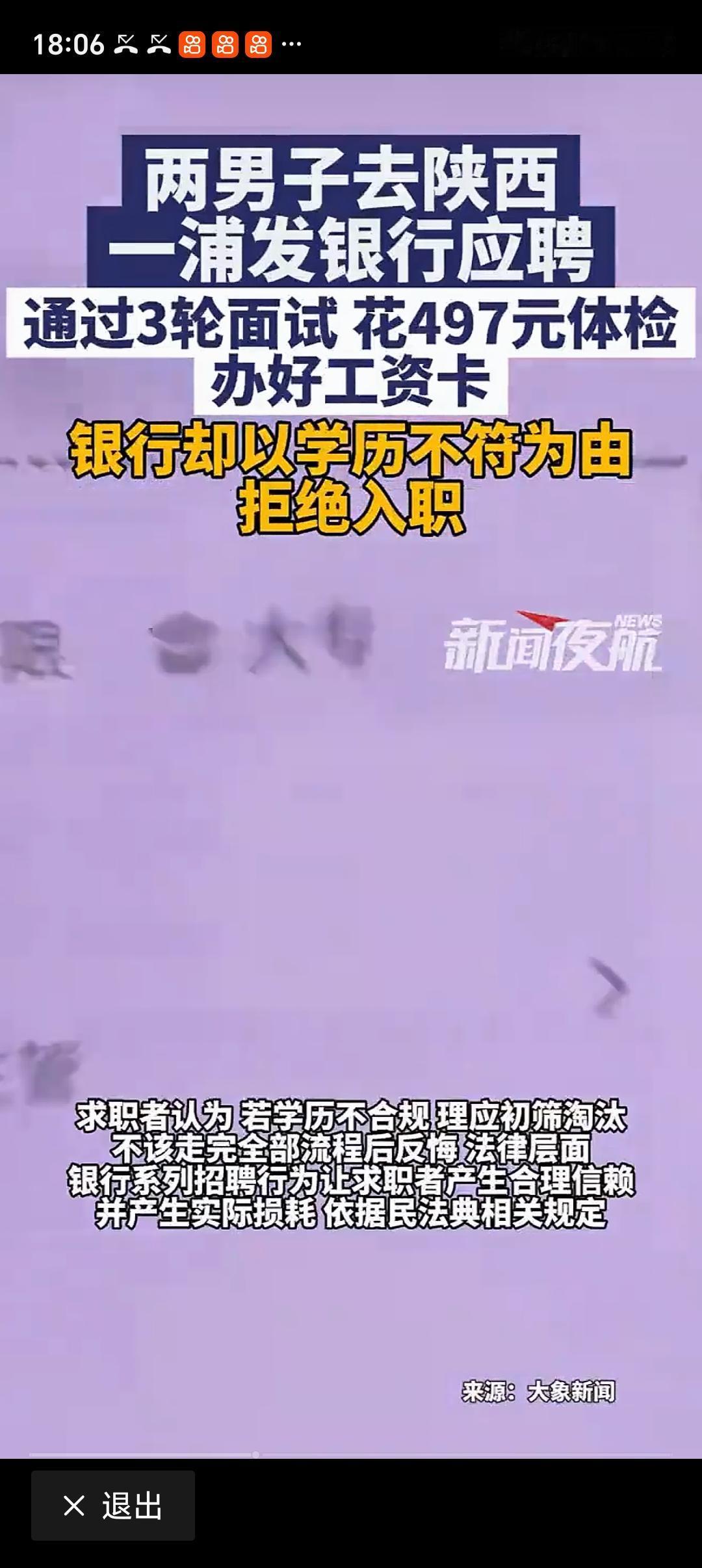 男子通过3轮面试却因学历不符被拒 男子通过3轮面试却因学历不符被拒,这事儿看着就闹心。有人说公司背调严格防造假没错,可这次是档案误差,又不是故意造假。部队情况特殊,档案记录有出入很正常,就差一年,不能因制度“一刀切”就把人家拒之门外。 这让我想起陕西咸阳那俩求职者,历经三轮面试、提交15份资料、自费体检办卡,最后还是因学历不符被拒。银行招聘流程倒置,这不是把招聘当儿戏吗?从法律上讲,银行可能构成缔约过失责任。企业招人,不能只看“纸上的时间”,得看看“背后的人”,不然再谨慎也是“死板”。