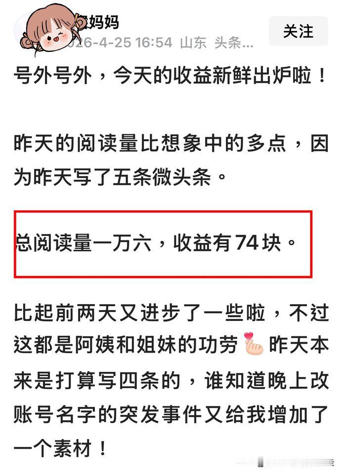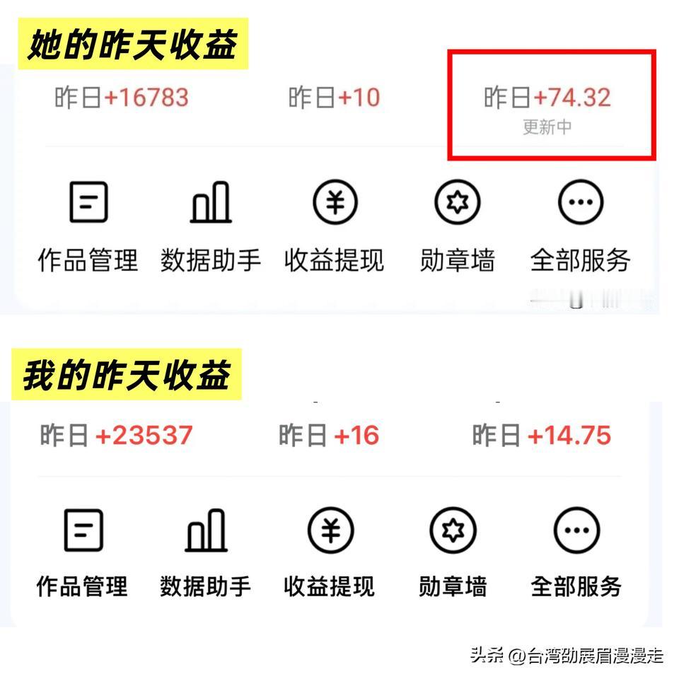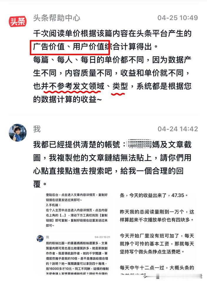 台北人在苏州,对于为何我的文章千次阅读收益只有0.5元,而另一位各种数据都不及我的创作者,却是我十倍的收益这事,头条官方客服的回答让我想放弃经营头条了⋯ 一句话:「用户价值低」囊括一切。 昨天写过的那位创作者,她的微头条收益我连续看了几天,应该是真实的。昨天她的阅读量在一万六,收益74元多,而我的近二万四的收益,才14元(图二)。我昨日新增加的粉丝甚至比她还要多,要说我各项数据不及她,可能性太低,能比较多我都检视过了,没有任何理由两人之间的收益可以差到十倍。 直到看见头条官方回复(图三),我恍然大悟,原来收益高低是头条给你个人的「定价」决定文章阅读单价。 原来我50岁、硕士学历、居住在江苏的台湾人,在头条的官方价值评估就是这么低?如此,我还写什么呢?实在太不合理了⋯头条把创作者分成三六九等,我是最低等的那种。 劣币驱逐良币,行吧~