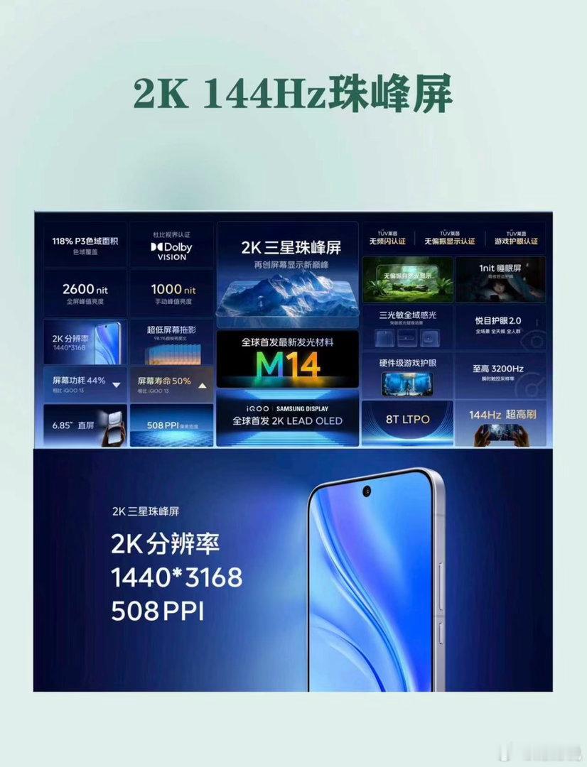 再配上2K 144Hz三星珠峰屏,首发M14发光材料,亮度、色准、护眼直接拉满,低功耗技术也安排上了,玩久了眼睛也不酸,508PPI的细腻度,看啥都清清楚楚。