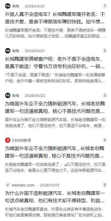 为什么外国不造新能源汽车?长城老总魏建军一句话捅破窗户纸:他们也有技术,他们不是不会造电车,是他们压根不想造! 麻烦看官老爷们右上角点击一下“关注”,既方便您进行讨论和分享,又能给您带来不一样的参与感,感谢您的支持! 这两年,中国马路上绿牌车越来越多,可那些传统汽车强国的老牌车企,在新能源这条路上反而磨磨蹭蹭。很多人奇怪,难道是他们技术跟不上?长城汽车董事长魏建军在2025年初的一次内部发言里,一句话就点破了这个问题——外国车企不是不会造电车,是他们压根不想造。 这话听上去有点狂,但仔细想想背后全是算盘珠子响。外国人真的造不出电动车?肯定不是。电动机、电池、电控这些基础技术,当年中国还没起步的时候,欧美日那些大厂早就搞过实验。问题不在于会不会造,而在于造了划不划算。就拿专利来说,外国车企在燃油车上摸爬滚打上百年,手握一堆核心专利,每年光靠这些就能收大把的授权费,相当于躺着赚钱。一旦转型纯电,等于自己掀翻桌子,从定规矩的人变成了跟别人拼成本的普通玩家。 更头疼的是供应链的现实问题。这几年全球新能源供应链的重心快速向中国倾斜,从国际咨询机构Fastmarkets2025年的报告来看,中国掌握着全球约70%的锂精炼产能,而且正在超越澳大利亚成为世界最大的锂矿生产国。也就是说,外国车企真要全力搞纯电车,从电池到各种核心材料,很大程度上得找中国供应商。把产业链主动权交出来,这对于那些习惯了掌控全局的大车企来说,肯定是难以接受的。 大众这几年在转型路上摔得挺惨的。2025年全年营业利润只剩下88.68亿欧元,和2024年的190.60亿欧元比直接腰斩,营收虽然有3220亿欧元,但利润率大幅缩水。大众这边要在电动化、软件和电池上烧钱,那边在中国市场的销量还不断往下掉,结果就是燃油车的利润撑不住,电动车的成本又降不下来,两头为难。 福特的电动车业务同样成了“赔钱货”。2023年这个部门亏了47亿美元,原因很简单,为了跟特斯拉竞争,福特在研发上投入太大,生产线和电池工厂也要花不少钱,偏偏销量上不去,成本摊不薄。福特CEO吉姆·法利自己都承认,纯电动车短期内根本赚不到钱。到了2025年,福特不得不踩刹车,把重心转向混动和更小更便宜的电动车,放弃纯电“一步到位”的激进策略。 和那些在电动化赛道上烧钱却看不到底的同行相比,丰田的日子简直舒服多了。2023财年,丰田交出了一份让同行眼红的成绩单——营业利润首次突破5万亿日元大关,折合人民币约2490亿元,比去年将近翻了一倍。赚钱的秘诀其实不复杂,就是靠混动和燃油车两条腿走路,尤其是混动车型在全球卖得非常好,既符合环保趋势,又省下了大规模铺充电桩的钱。丰田这种稳扎稳打的策略,也让不少欧洲车企开始重新掂量电动化急转弯到底值不值。 奔驰在2024年就悄悄改了主意,把原先2030年卖纯电的目标往后推了五年,转头又把钱花在了燃油发动机的升级和延寿上。奥迪也跟着打起了“双保险”,虽然口头上说2033年要全电动化,但在主力车型上继续保留了燃油版和插混版的双线布局。说白了,趁着燃油车和混动车还能稳稳赚钱的时候,谁都不想为了不确定的未来把底牌全赌上。 跟那些被老业务拖累的传统巨头相比,中国新能源车企反而占了便宜——没有历史包袱。蔚来这几年在欧洲市场布局得挺快,到2026年已经覆盖了十几个国家,还在德国、荷兰这些地方搞起了经销商和直营并行的新模式。理想也在2026年正式出海,把目标瞄准了中东和东南亚。比亚迪更猛,2026年初光是出口到巴西的车就超过了5万辆,欧洲市场也在稳步放量。 所以魏建军那句话虽然尖锐,但确实戳中了痛点。外国车企不是技术不行,而是转型的代价太大,燃油车的利润、技术专利和成熟的供应链体系,哪个都舍不得丢。而这场全球汽车产业的变局,正在被一个简单又残酷的现实改写——谁包袱更轻,谁转身更快。
