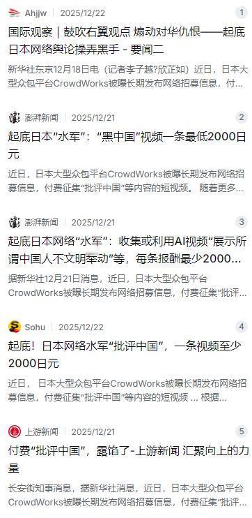日本民众称,希望再次入侵中国,吞并中国?并扬言称中国根本不是胜利国,假装自己是胜利国,还说中国人说谎就像呼吸一样,所以全世界都不喜欢中国人! 麻烦看官老爷们右上角点击一下“关注”,既方便您进行讨论和分享,又能给您带来不一样的参与感,感谢您的支持! 最近,日本那边有些极右翼网络账帖又开始兴风作浪了。说什么“如果中日再战,中国将并入日本领土”、“日本不是战胜国,中国在假装胜利”,甚至还有更过分的“希望再次吞并中国”这些完全罔顾历史事实的荒谬言论。虽然这些言论不代表全体日本民众,但透过它们暴露出的系统性舆论操作和右翼势力的沉渣泛起,绝对值得咱们每个人高度警惕。 先来说说最直接的——日本这个网络反华行为,现在已经完全“工业化”和“外包”化了。2025年11月起,日本大型众包平台CrowdWorks被曝长期发布招募信息,付费征集“批评中国”的短视频,每条报酬2000至4000日元(约合90至180元人民币)。发包方从2024年11月到2025年11月,至少发布了14条这类招募信息。《朝日新闻》4月的调查更狠:博主通过兼职场接单,AI批量生产“中国人做出扰民行为,最终自食恶果”的虚构视频,配备详细操作手册,几分钟就能生成一条煽动性视频。AI凭条指令从脚本生成到画面合成全程流水作业。条招聘条件甚至明确写着“热爱日本、反感中国”。一名60多岁的前政府公务员坦言,起初做棒球类视频广告单价约300日元/千次播放,反华视频则高达1000日元/千次,完播率更高,收益最多时每月约60万日元,而且还“很稳定”。该男子自述从未去过中国,也没和中国人打过交,但就是“讨厌中国人”并以制作为动机。另一20多岁的上班族也透露,从2025年秋天左右起,“批判中国类”订单明显增多,而这个时间点恰好与中日关系因涉台错误言论降温和重合。 有接单的大学生也直言:“我本人并不这样想,但最终还是照做了,毕竟是当工作在干。有些客户会说,‘真相无所谓,要做得更刺激一些’”。TBS电视台今年3月的节目更是彻底揭露了整个利益链条:发包者提供政客素材接单者完成短视频后交给外包方发包者通过社交媒体账号获取广告收益。在日本网络平台上,甚至还有帖文公开发招聘“点赞”和“评论”,要求接单者每天点赞和评论300次,复制粘贴评论内容也无所谓。面对这些确凿事实,许多日本网已直接在社交平台上掀起“抗议CrowdWorks”话题标签,怒斥其已成为“右翼舆论制造机”。 这也专家感叹,这种现象和二战前日本军部利用舆论操弄煽动战争狂热的手法存在“令人不安的相似性”。更有观察指出,在注意力经济时代中,愤怒、厌恶和仇恨等负面情绪更容易带来关注和金钱,某些政客也趁机坐上了政治顺风车。 再来看看教育这块,日本的教科书篡改和歪曲已经触目惊心了。2025年春季,日本文部科学省审定通过的高中历史教科书,再次恶意篡改南京大屠杀的内容,将举世震惊的惨案轻描淡写成“南京事件”,在死亡人数上制造所谓“多种说法”的模糊空间,对“慰安妇”制度用“女性从事相关从业”加以掩盖。 目前日本全国初中采用率最高的新版教材,覆盖率合计接近80%。帝国书院出版社使用“南京事件”一词,写道“在南京,除了士兵,还有很多平民被杀”,但完全没有明确指出加害者是谁。东京书籍出版社虽然脚注中提及“南京大屠杀”,但两者均称“受害人数尚无定论,仍在研究中”。有关“慰安妇”问题,教材仅以“被占领地区女性受到动员”“在战地被迫工作”等措辞一带而过,丝毫不涉及性奴隶的本质和制度性强制等问题。 更让人心寒的是,教材甚至在结构上做文章,将1931年至1945年的“日中战争”与1941年爆发的“太平洋战争”人为割裂,把日本侵略的整体脉络彻底切断,让人感觉日本像是在被迫应战一样。 日本历史教育者协议会前委员长石山久男指出,近年来右翼阵营的策略已发生明显转变,从原先推动极端右倾教材扩大采用,转向推动所有教科书的整体右倾化。还有些日本教材甚至篡改钓鱼岛主权,直接固化和写入所谓的“日本固有领土”表述,变本加厉地否认历史真相。用该团体事务局长糀谷阳子的话说:“如果孩子们不了解战争发生的过程,就无法对现实抱有危机感”。