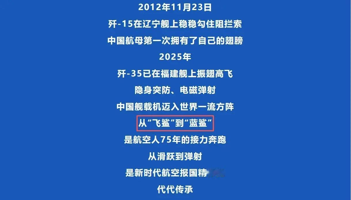 官方首次公开承认,歼-35舰载战斗机的绰号叫“蓝鲨”。 在4月23日海军成立77周年(海军节)当天,航空工业沈飞在《海军节 | 向海图强,不负深蓝》主题推文中,首次公开正式确认歼-35隐身舰载战斗机的官方绰号为“蓝鲨”。(图二) 事实上,“蓝鲨”的称呼早有流传痕迹了,在2024年珠海航展上,沈飞相关设计研究所的臂章就已出现相关元素,相关定名信息最早可追溯至2022年,但始终没有官方公开的权威确认,此次海军节官宣,正式让这一绰号尘埃落定了。 “蓝鲨”这一命名严格遵循了中国军用飞机统一命名规则,形成了完整的谱系传承。 海军舰载机专属命名体系规则明确海军舰载战斗机以“鲨”为命名主题,此前歼-15官方绰号为“飞鲨”,电子战型歼-15D为“电鲨”,“蓝鲨”则完美延续了这一序列,同时“蓝”字精准契合歼-35驰骋深蓝、隐身突防的海军作战定位。 与舰载型舰-35“蓝鲨”形成对应的是,歼-35的空军陆基型号歼-35A的官方绰号为“云龙”,也是遵循了空军战斗机“龙”字系列命名规则,这是同平台不同军种型号的命名规范区分,能够更好的区分。 从“飞鲨”到“蓝鲨”,对应着中国航母从辽宁舰、山东舰的滑跃起飞模式,到福建舰电磁弹射模式的跨越式升级。