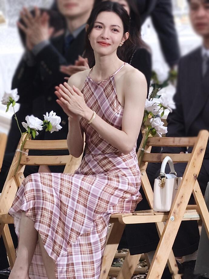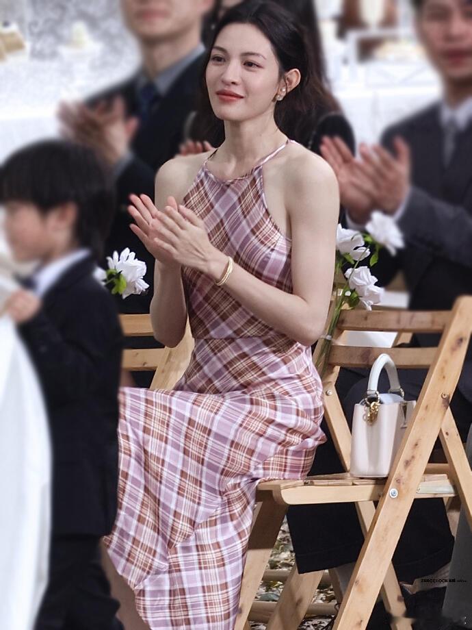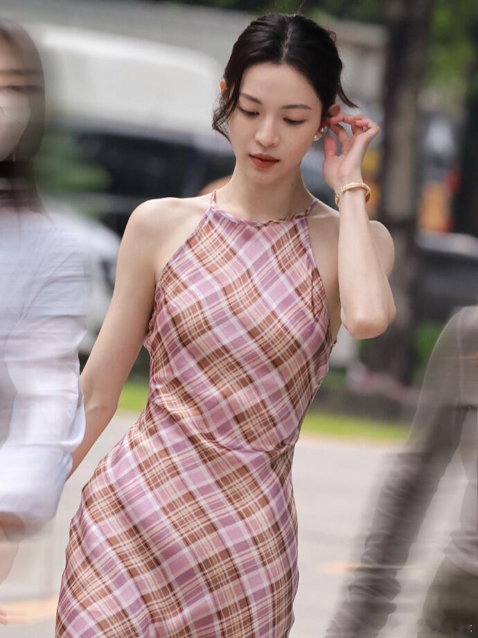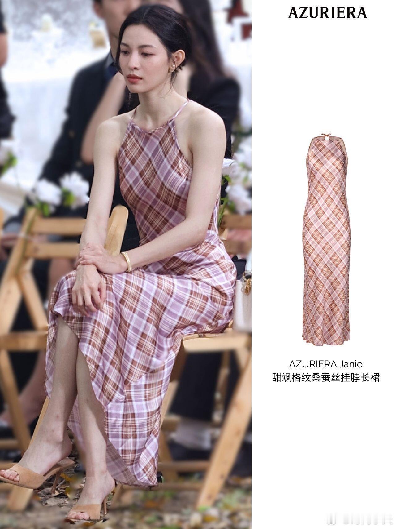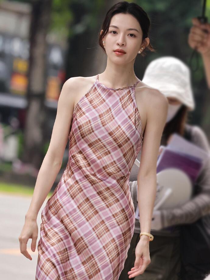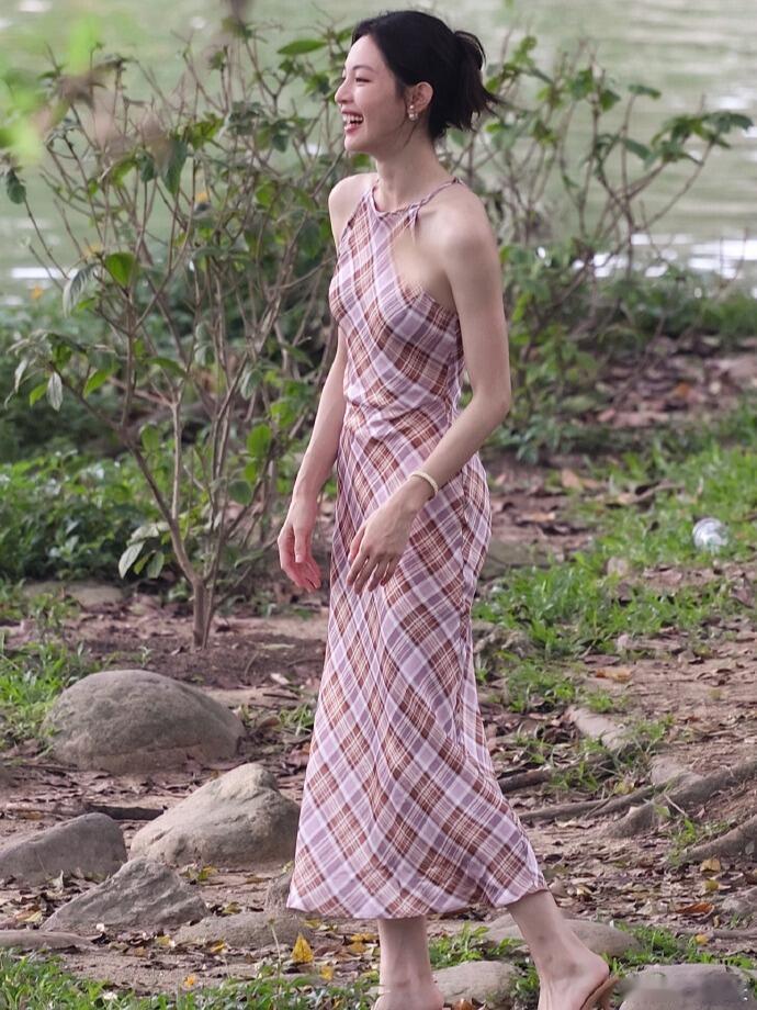 粉棕格纹挂脖长裙+裸色细高跟钟楚曦法式复古那味儿拉满了!