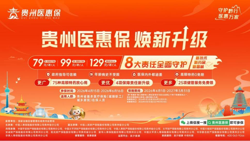 贵州,这片山水相依的热土,不仅承载着多彩的民族风情,更将“健康守护”深深融入城市温度之中。在这里,一份由政府指导、专为贵州人定制的健康保障——“贵州医惠保”,正以焕新之姿,成为千家万户抵御大病风险的可信赖后盾。 它的参保门槛极低,包容性极强。只要是贵州省基本医保参保人,含职工、居民,不限年龄、不限户籍、不限职业、不限健康状况,即便是患有既往症的人群,同样可保可赔。这份“一个都不少”的普惠承诺,真正让保障惠及每一位普通人。 保障方案实实在在,直击大病花费的痛点。 2026年度产品按年龄分档缴费:0-18岁79元/年 18-50岁99元/年 50岁及以上129元/年 提供八大保障责任。它不仅覆盖医保内外的住院自付自费费用,更将75种国内外特药、CAR-T疗法、质子重离子治疗、钇[90Y]微球注射等前沿医疗技术纳入保障,部分责任0免赔额,切实减轻高额医疗支出负担。 支付方式灵活,服务更具“黔”味。支持职工医保个人账户余额为本人及家人含配偶、父母、子女投保,实现全家一键防护。此外,25项健康管理服务,如健康咨询、慢病管理,参保即享,即便不理赔,也能享受日常的健康关怀。 这份触手可及的“贵州温度”,正在为无数家庭兜住健康底线。在2026年6月16日参保截止前,只需花费几十元至百余元,就能为全家换回一整年的安心守护。少一份担忧,多一份从容——这正是“贵州医惠保”赋予贵州人的踏实底气,让健康陪伴,温暖日常每一天。