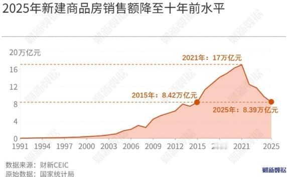 如何看待 2025 年国内新建商品房销售额降至 8.4 万亿元,回到十年前水平? 2025年销售额8.4万亿,销售面积8.8亿平米——这两个数,确实都回到了2015年前后的水平。 但十年前,市场还往上走。那时候城镇化还在推进,每年很多人进城; 大家负债没那么高,加杠杆的空间还大;房子除了住,还普遍被看成是能增值的资产。 所以,当年冲到8万亿,那是上升途中的一个台阶。 现在呢?2025年,城镇化速度已经慢下来了,人口总量也开始往下走; 居民部门的债务率已经不低了;最关键的是,越来越多人不再坚信“买房必涨”了。 所以,现在这个8万亿,是在预期改变、市场趋势向下或者横盘的时候出现的。 同样的数字,十年前像是“加油站”,现在可能只是下行路上的“一个站点”。 再看数字是怎么构成的。 销售额 = 销售面积 × 单价。 2025年销售面积大约8.8亿平米,这比2021年的高点(接近18亿平米)少了将近一半。 而全国新房均价,大概从2023年高点的每平米1.04万元,降到2025年的9500元左右,跌了差不多8.6%。 这里就能看出关键了——市场收缩,主要不是价格崩了,而是成交量大幅萎缩。 价格是在跌,但跌得相对慢;真正剧烈变化的是“能成交的量”,是愿意买并且也买得起的人,变少了。 流动性下降,是比价格下跌更核心的问题。 销售额回到十年前,不是因为房价降回了十年前,而是能卖出去的房子,数量回到了十年前。 再往深一步看,不能只看新房。 新房只是市场的一部分,现在它前后都受挤压。 前面是一大堆二手房挂牌,价格调整更灵活,在跟新房抢客户; 后面是已经开工、不得不继续建的楼盘,有“保交楼”的任务必须卖。 新房被夹在中间了。 而且,现在很多买房需求流向了二手房。 但二手房的流转也不顺畅——很多人卖不掉旧的,就换不了新的,整个“卖旧买新”的链条转不动了。 所以,新房销售额下降,不只说明新房难卖,更反映了整个市场的大循环变慢、卡住了。 那市场什么时候能稳住? 销售额这个数字什么时候止跌,可能不是最重要的。真正的稳定,是得形成一个新平衡。 所以,8.4万亿这个数,最重要的意义也许是:它标志着一个阶段的结束。 那个靠快速城镇化、上涨预期和金融杠杆推动市场高速扩张的时代,已经过去了。 现在市场正用销售额下滑、交易萎缩的方式,做一场调整。 这场调整的目的,就是去找一个新的、更可持续的平衡点。