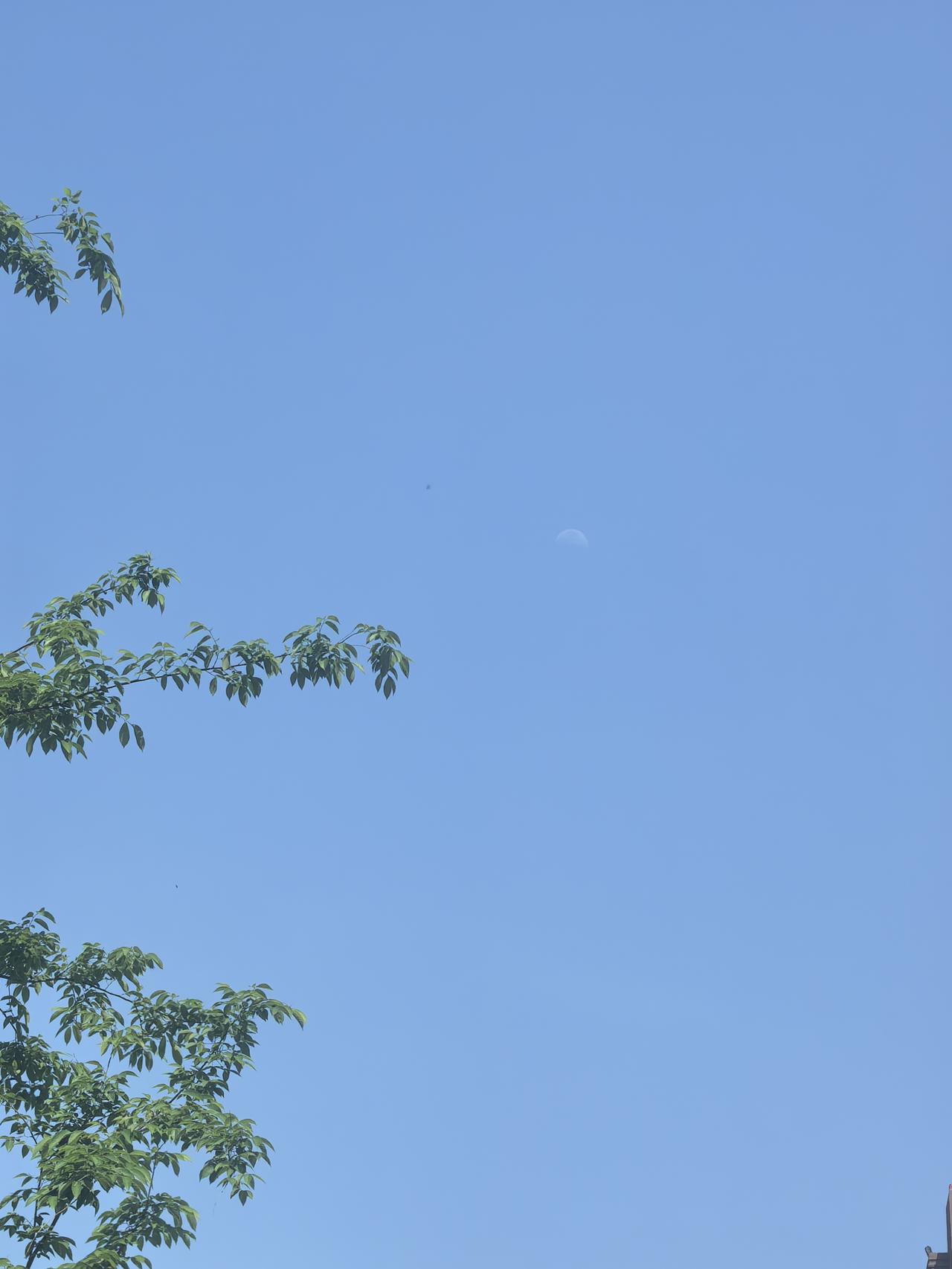 午后一点四十左右,抬头偶然往天上一看,天干净得不像话,蓝得透亮透亮的。 没想到大白天里,一弯月亮就静静挂在半空,和太阳的光亮遥遥呼应,妥妥的日月同辉。 旁边树叶鲜鲜亮亮的,风轻轻晃着枝桠,天气舒服得不像话。 白天能看见月亮真的太奇妙了,阳光正好、月色浅淡,一昼一夜的光景撞在了一起,平凡普通的午后,忽然就多了份不期而遇的小浪漫,心情一下子就松弛下来,满是安然与惬意。