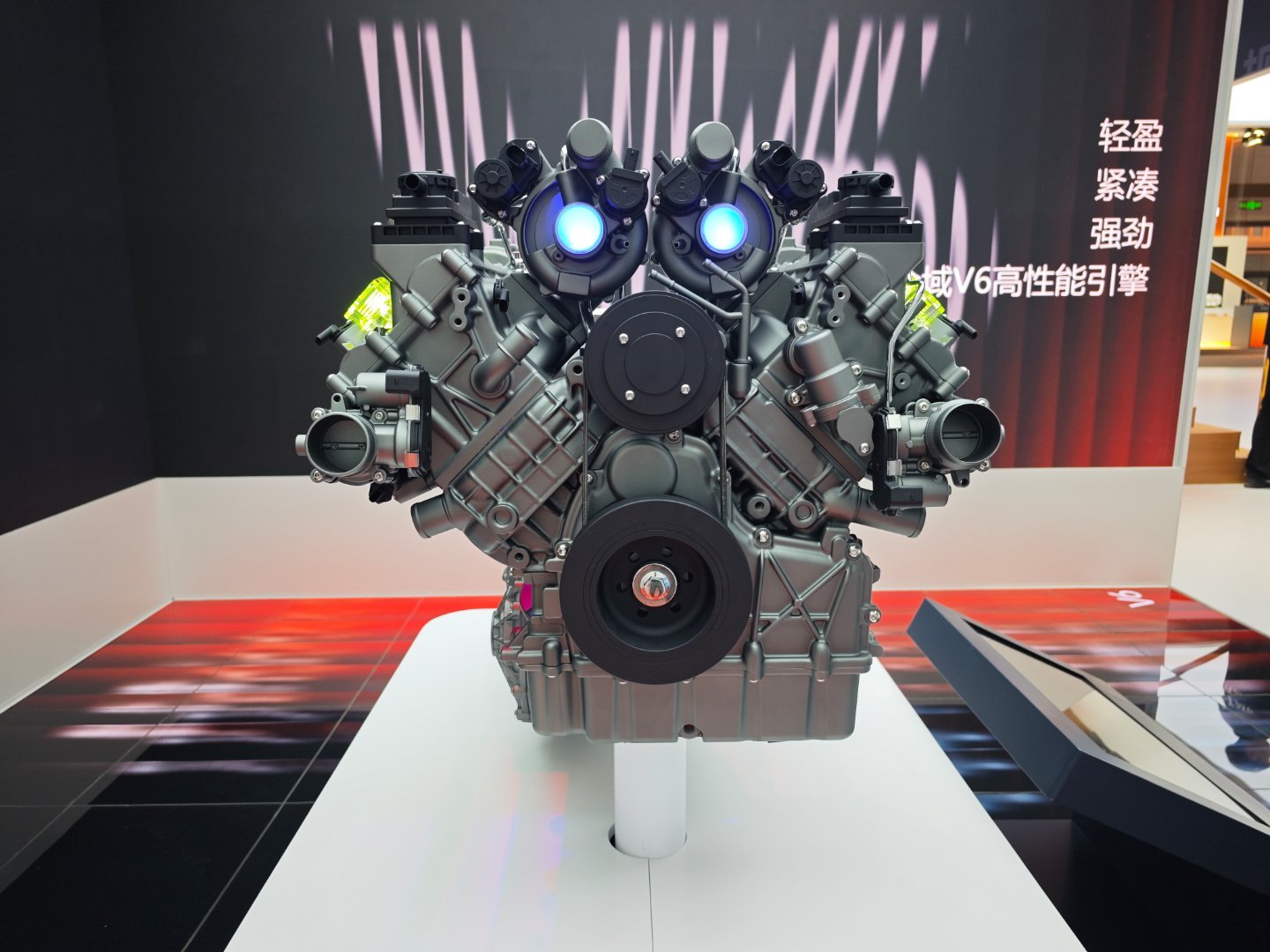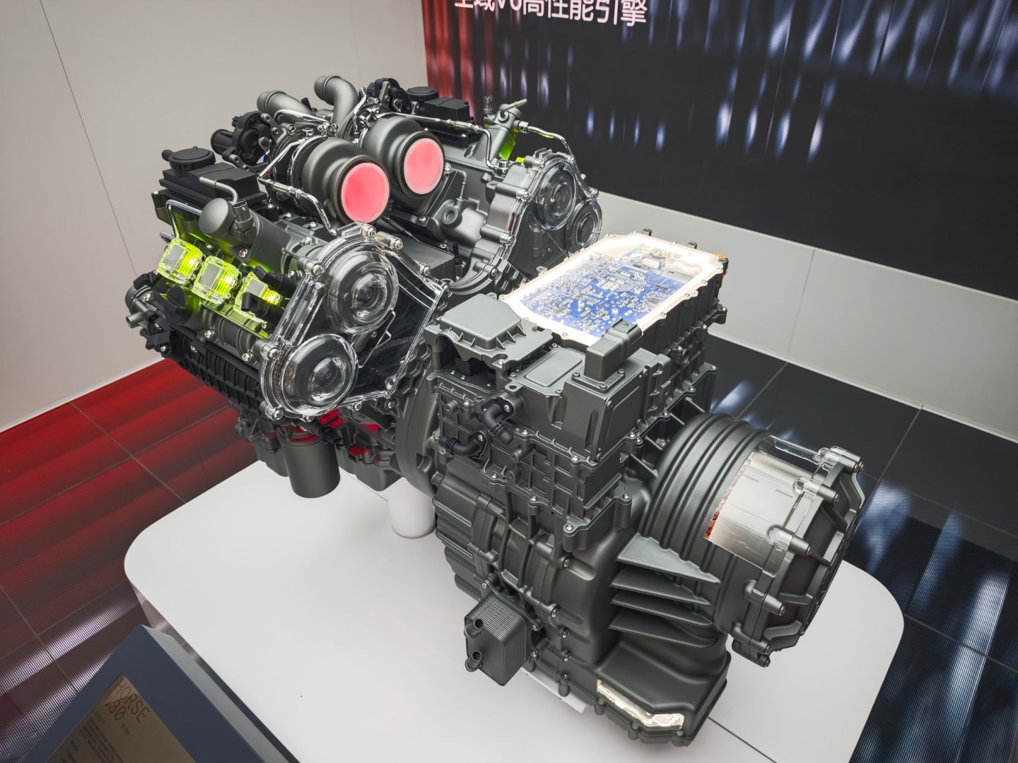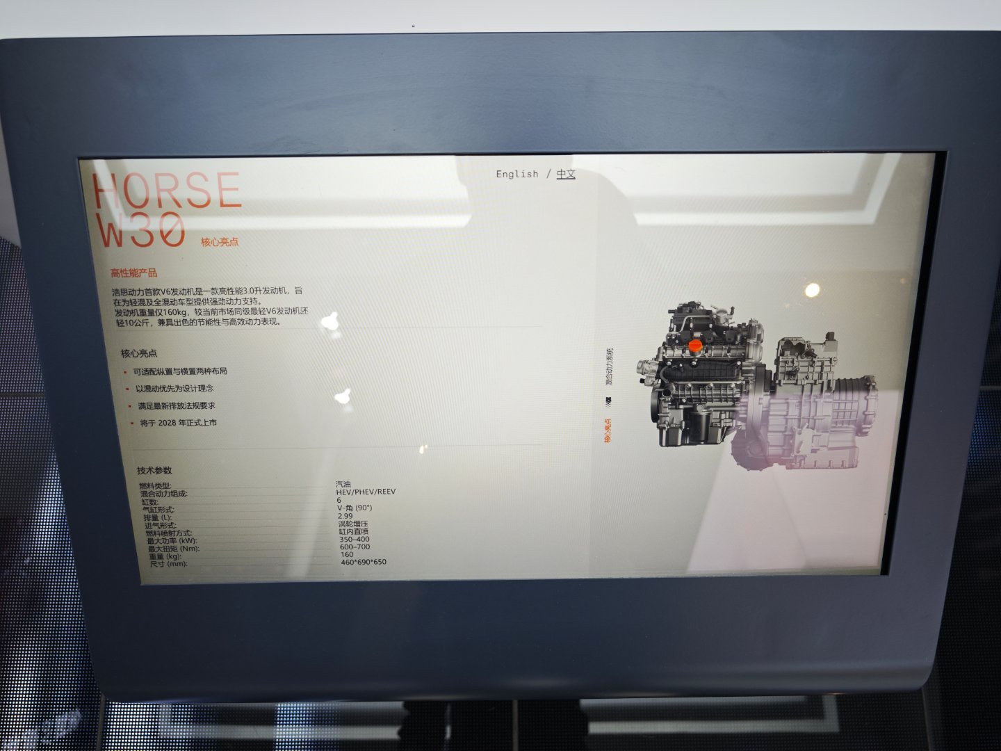浩思V6 3.0T发动机,V型发动机,90°气缸夹角,涡轮增压,缸内直喷,最大功率350-400千瓦,峰值扭矩600-700牛·米,重量160公斤,可适配HEV/PHEV/REEV