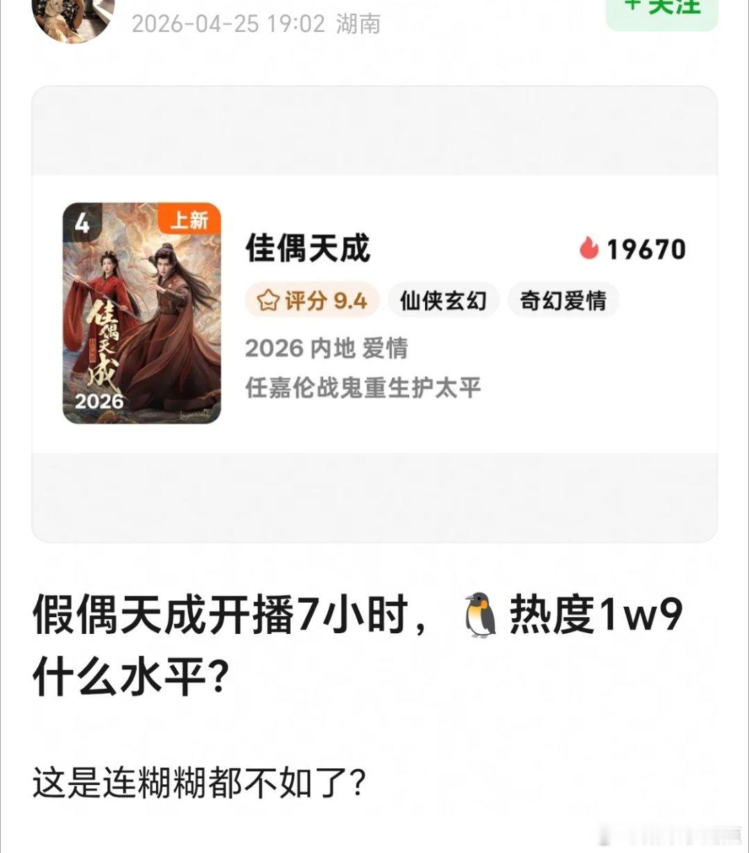 任嘉伦王鹤润《佳偶天成》开播7小时热度19000,这波直接给冰湖重生兜底了😂离了欢瑞剧本资源全线滑坡,糊得肉眼可见;女主争议缠身,俩“话题绝缘体”凑一起,效果加倍拉胯。