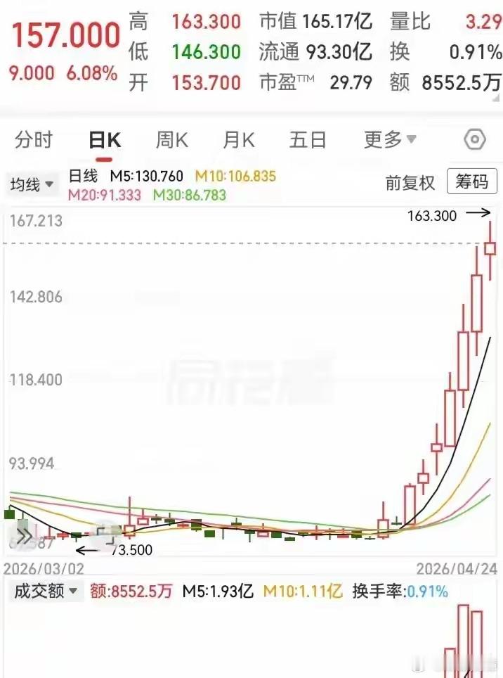 一周飙涨100%!70块冲上160块,这波行情到底踩中了什么开关?说实话,上周五收盘看到K线图那一刻,我手里的保温杯差点没握稳。就那么几天,70多块跌了一年多的票,唰一下站到了160块——不是复权,是实打实的交易价格,一分没水分。盘中连拉三根长阳,第二天直接跳空高开,第三天缩量再涨,第四天干脆在五日线上方稳稳踱步,像踩着梯子往上走,每一步都踩在均线的托举里。你要是翻K线,会发现突破那根压力线那天,量能突然比前五日均值高了快40%,但后面几天又慢慢收回来,不炸不躁,温温吞吞地推。这不是游资乱打的火药味,倒像是主力悄悄把底仓全换完了,再轻轻一推,市场自己就跟着走。红三兵?老股民都懂,可真等到它走完三根,黄花菜都凉了——等你看清形态,价位已经涨出去二十个点。我朋友老张上周二还在群里吐槽:“这票再跌我就清仓去卖烤冷面。”结果周三他挂单想割,发现根本没成交——买盘挂单密密麻麻堆在135、138、142,全是整数关口,硬生生把抛压全吸走了。周四他改挂145,还是没成。周五他懵着点开账户,浮盈数字跳到68.3%,手指抖着截图发来:“这哪是炒股,是坐火箭漏气了还往上蹿。”五日线现在成了铁护栏,只要不跌破,上涨节奏就没乱。但昨天盘后我盯了半小时分时量柱,发现尾盘半小时放量明显减弱,159.7到160.2之间连续三次冲高回落,每次都在同一价位被压下来。不是没人买,是买进去的人立马就跑,短暂停留都没超过三分钟。这种“踮脚试探”的感觉,你懂的——就像人站在楼顶边沿,往前一步是风,往后一步是命。要是哪天开盘就缩量低开,五日线一碰就破,那别犹豫,先撤为敬。行情不怕慢,就怕静。静得越久,后面摔得越重。