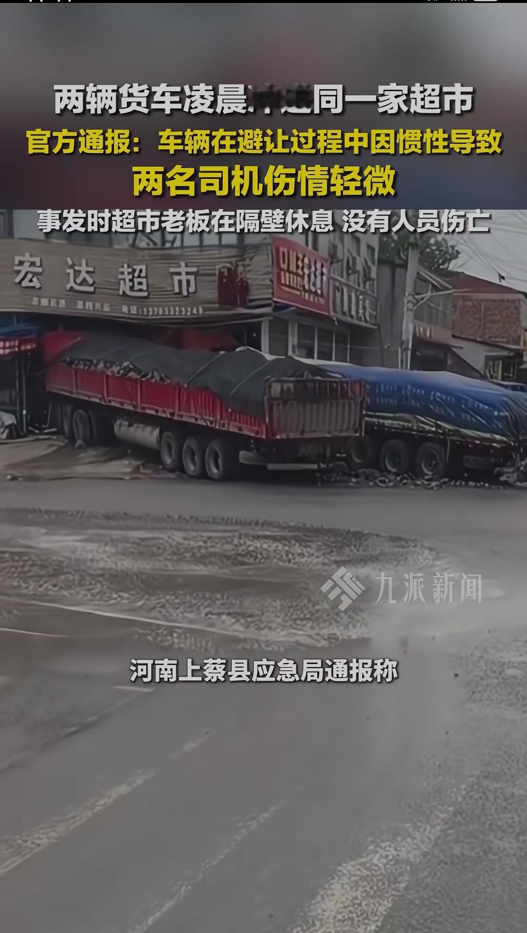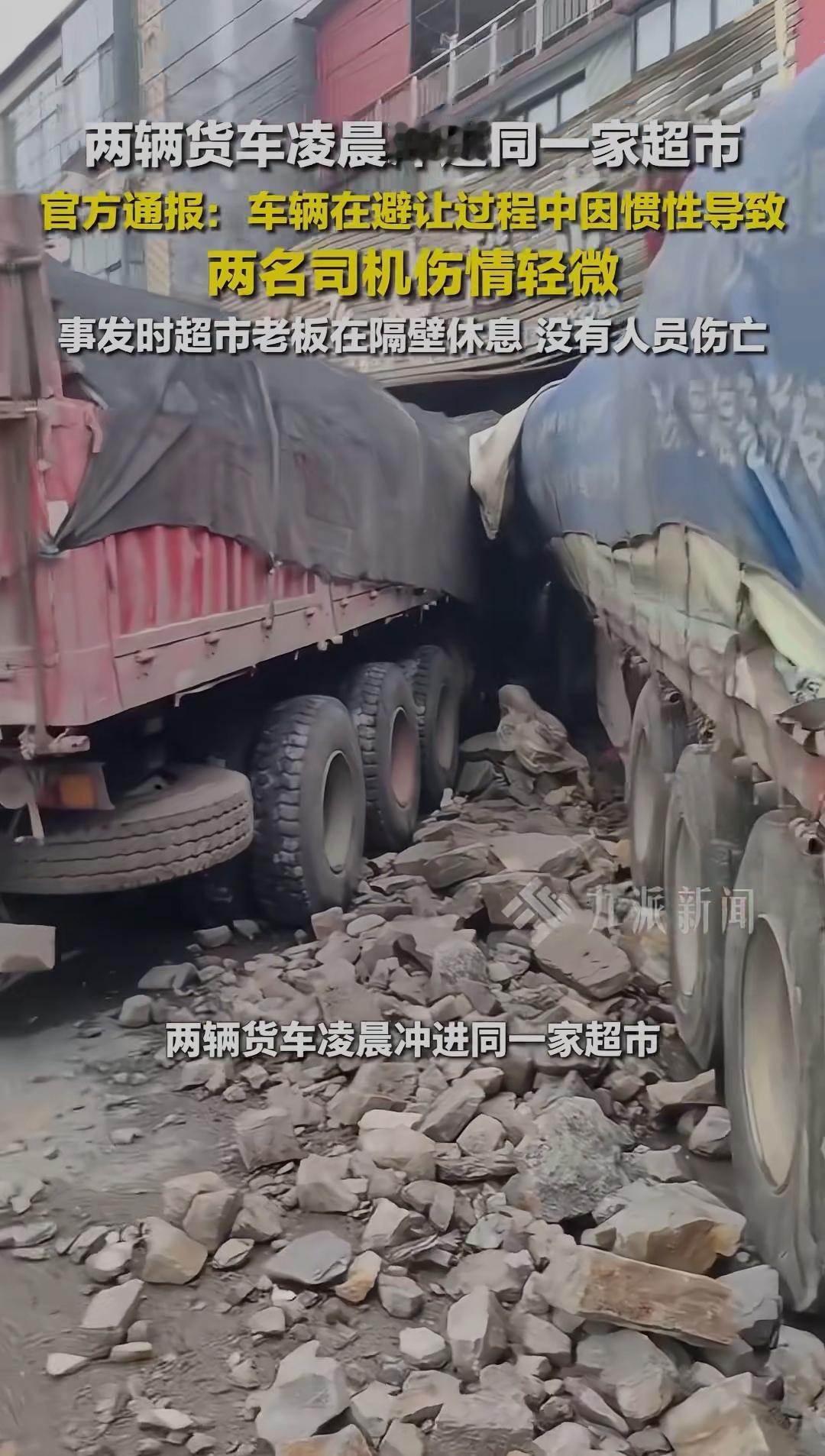两辆货车凌晨冲进同一家超市开车在路上、永远不能掉以轻心、安全第一 两辆货车凌晨冲进同一家超市,离谱场面瞬间引爆网络。官方随后发布通报,此次意外是司机避让车辆时,受惯性影响失控撞入,两名司机仅受轻微伤情,万幸超市老板当时在隔壁休息,整场事故无人员伤亡。 很难想象,好好的街边超市,竟在深夜接连遭遇两辆货车撞击,门面严重受损,货架凌乱倒塌,现场一片狼藉。深夜车流稀少,本是行车平稳的时段,谁也没料到会发生如此巧合又惊险的一幕。 看似偶然的意外,实则藏着行车安全的细节问题。夜间视线受限,驾驶员反应速度变慢,若行车速度把控不当,遇到突发状况紧急避让,很容易因惯性失控。短短一瞬间的操作失误,就酿成了财物受损的意外,好在这次所有人都平安无事,算是不幸中的万幸。 不少网友看完现场画面直呼后怕:“隔着屏幕都觉得惊险,还好没人受伤”,也有人感慨,开车上路永远不能掉以轻心。无论是白天还是深夜,谨慎驾驶、减速慢行,才是规避风险的关键。 生活里的意外往往猝不及防,一次疏忽就可能造成难以挽回的损失。这件事也给所有车主敲响警钟,遵守交规,保持安全车速,时刻留意路况,才能守住出行平安。 你如何看待这场巧合的意外?日常开车遇到突发情况,你会选择紧急避让还是减速制动?不妨在评论区聊聊你的看法。