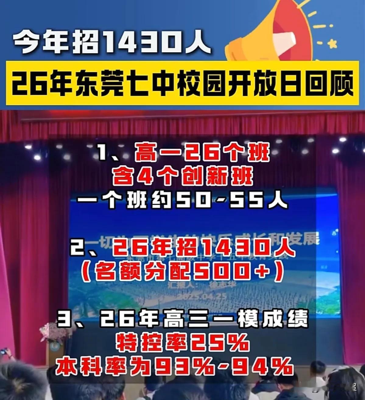 4月25日,东莞市第七高级中学校园开放日活动现场情况。 东莞七中属市直属公办高中,近几年与松湖莞中教研资源共享多,高考成绩显著,是东莞公办高中里典型的“低进高出”代表校,往年一直是东莞中考中等生的热门首选。 不过随着今年东莞七中正式纳入“东莞十六大校”名额分配范围,学校热度进一步提升,今年中考录取分数线预计将会明显上涨。