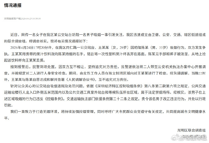 【女子公交站劝阻男子灭烟起争执,用饮料泼向对方……最新通报:所在区域属禁烟场所,男子被罚款,双方和解互不追责】#官方通报女子劝阻男子吸烟引争执##深圳公交站台吸烟男子被罚款# 深圳光明区联合调查组发布情况通报:近日,网传一名女子在我区某公交站台劝阻一名男子吸烟一事引发关注。我区迅速成立由卫健、公安、交通、辖区街道组成的联合调查组。经调查核实,现将有关情况通报如下:2026年4月24日17时20分许,在我区同仁路一公交站台,王某某(女,29岁)因劝阻陈某(男,33岁)吸烟行为,双方发生争执。王某某用携带的果汁饮料泼向陈某持烟的右手,随后将一次性塑料果汁杯丢弃在路面。陈某见手部和裤子被泼湿,从地上捡起该饮料杯向王某某丢掷。接到报警后,民警到场处置。因双方互不相让,坚持追究对方责任,民警遂依法将二人带至公安机关执法办案中心开展调查,并按规定对二人进行人身安全检查。期间,由女性工作人员在独立封闭区域内对王某某进行了检查。经沟通调解,当晚22时许,王某某与陈某自愿达成和解并签署《人民调解协议书》,互不追究对方责任。针对公众关心的公交站台吸烟违规及处罚问题,依据《深圳经济特区控制吸烟条例》第八条第二款第六项之规定,公共交通运输站楼行人出入口外侧五米范围内以及公共交通工具室外站台和等候队伍所在区域,属于法定禁烟场所。经核实,该男子在上述区域吸烟的行为已违反《控烟条例》。交通运输执法部门依据条例第三十二条之规定,责令该名男子改正违法行为,并处以行政罚款。我们一直致力于打造无烟环境,将持续加强控烟管理,同时呼吁广大市民群众自觉遵守有关规定,共同提高城市文明健康水平。