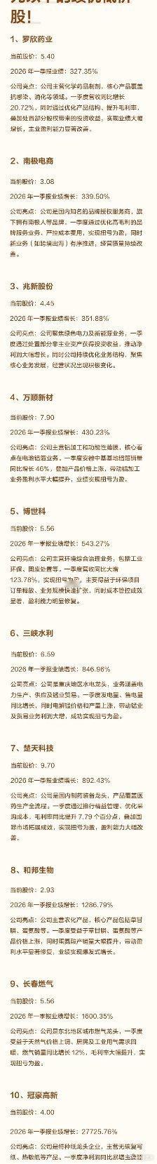 暴涨27725%!10元以下的低价绩优股一览现在的A股市场,高价股遍地都是,动不动就是百元以上,普通散户想进场奈何子弹有限。不可否认,股价的高低可以很大程度地反映出公司的内在价值,且这些高价股中以科技赛道的居多,是市场资金追捧的重要方向。但也不是说低价股就是一无是处,一点投资价值都没有,尤其现在进入一季报披露尾声,出现了不少低价股业绩暴增的,最高的甚至净利润同比增长超过27725%,这彻底打破了低价股无好货的刻板印象。今年二季度,A股延续高位震荡的格局,AI算力、半导体等前期热门板块估值处于相对高位,资金获利了结的意愿较为强烈。4月以来,50元以上的股票超过6成调整,平均跌幅超过10%。与之形成鲜明对比的是,不少10元以下的低价股逆势走强,且微盘股板块内批量个股走出连续上涨行情。这轮低价股行情,核心驱动力是业绩超预期爆发。与以往靠题材炒作的低价股不同,本轮领涨股都有实打实的一季报业绩支撑,净利润同比增幅从数倍到数十倍不等,且增长全部来自主营业务,无卖资产、靠补贴等一次性收益,扣非净利润同步高增。资金逻辑也从炒概念转向看业绩,北向资金、险资等机构资金大量抢筹,形成向上的合力不断推动股价拉升。截至目前,A股超过150家上市公司披露了一季报预告,其中净利润同比增长超过300%的个股不到30家,占比不到两成。在这少数高增长的个股中,同时满足低价绩优且估值处于低位的,更是凤毛麟角。从最新数据看,在全市场超过1000只10元以下的低价股中,一季度净利润同比增长超过500%的只有23家。其中,最高增幅达27725%,另有多只个股增幅超3000%、5000%,覆盖半导体、新能源、医药、周期等多个高景气赛道。这些股票并非垃圾股,而是业绩迎来爆发式增长、身处行业景气关键拐点的优质公司,之前大多因为市值小、关注度低而被市场忽视,但如今完全有可能凭借高爆发的业绩完成估值的提升。对于这些低价的绩优股,当前是否具备布局的价值,需要从多个维度充分考虑。首先,低价绩优股普遍处于估值低位,动态市盈率多在10倍以下,部分个股甚至低于5 倍,远低于行业平均水平。以存储芯片领域为例,一些低价股受益于AI算力爆发,订单确定性强,业绩爆发的同时,估值不到行业龙头的一半,修复空间非常大。即便市场继续震荡调整,低估值的安全边际足够高,可以大幅降低回撤的风险。此外,还要观察业绩增长的持续性。本轮业绩大增的低价股,增长逻辑并非短期偶然,一是周期反转;二是国产替代,医药、半导体领域公司凭借技术突破,抢占海外市场份额,业绩进入长期增长通道。可以确定的是,今年A股正在从业绩预期转向业绩验证,资金高低切换是很常见的事情。而绩优的低价股有业绩爆发作为支撑,加上估值相对较低,很容易持续承接从高位赛道流出的资金,行情有望从局部扩散至整体。但这并非等同于,低价绩优股都可以随时进场,因为部分资金完全可以利用业绩激增作为锚点,一波强势反弹之后,随之量能萎缩,成为弃子。总的来说,我们要学会从低价绩优股中找到估值合理、确定性强、景气度高的标的股,一定要分清是短期操作,还是说可以长期持有。文章主要传达选股思路和方向,不构成任何投资建议。如果文章内容涉及到个股,绝非推荐,股市有风险,投资需谨慎,请独立判断!低价股