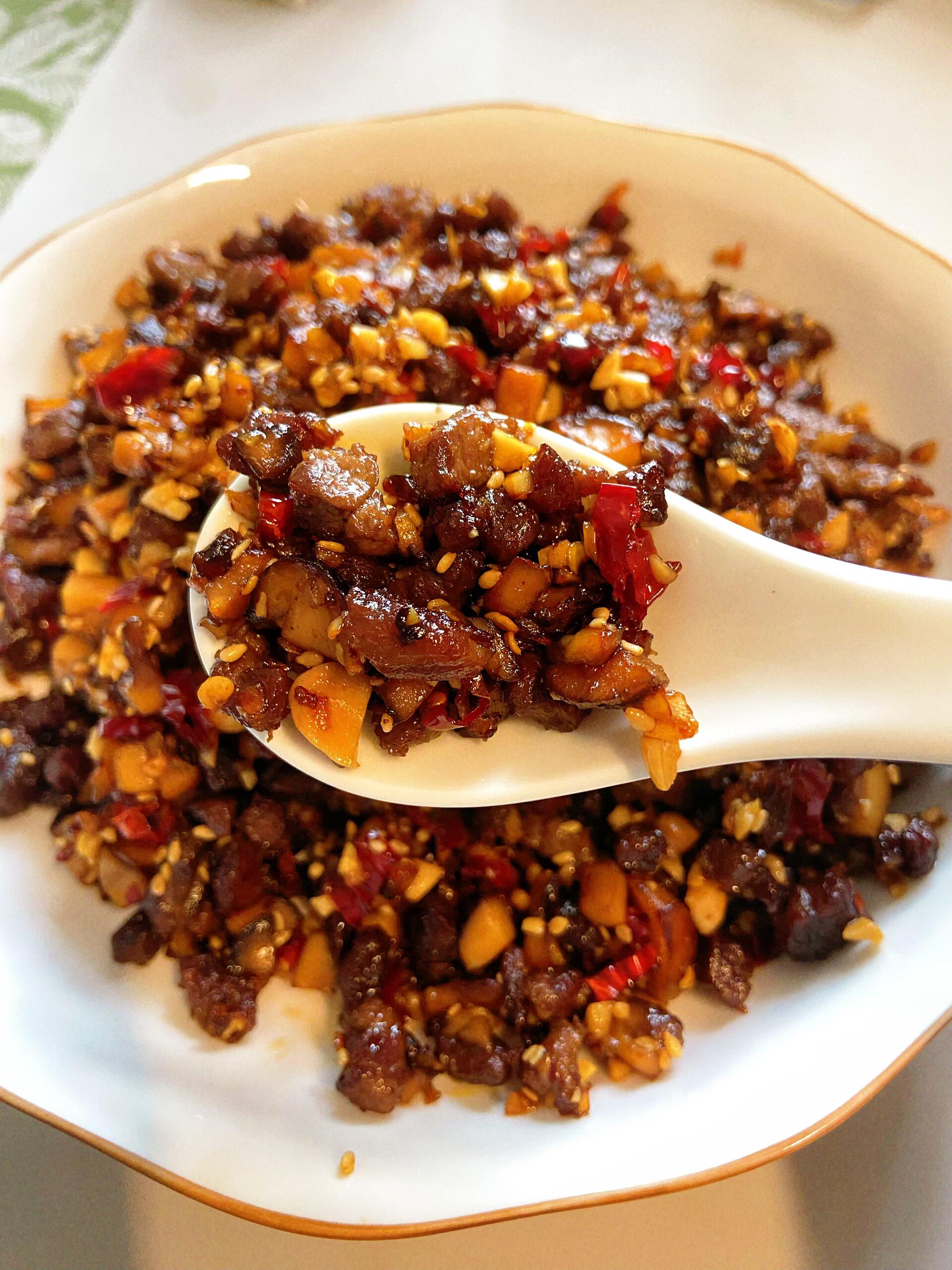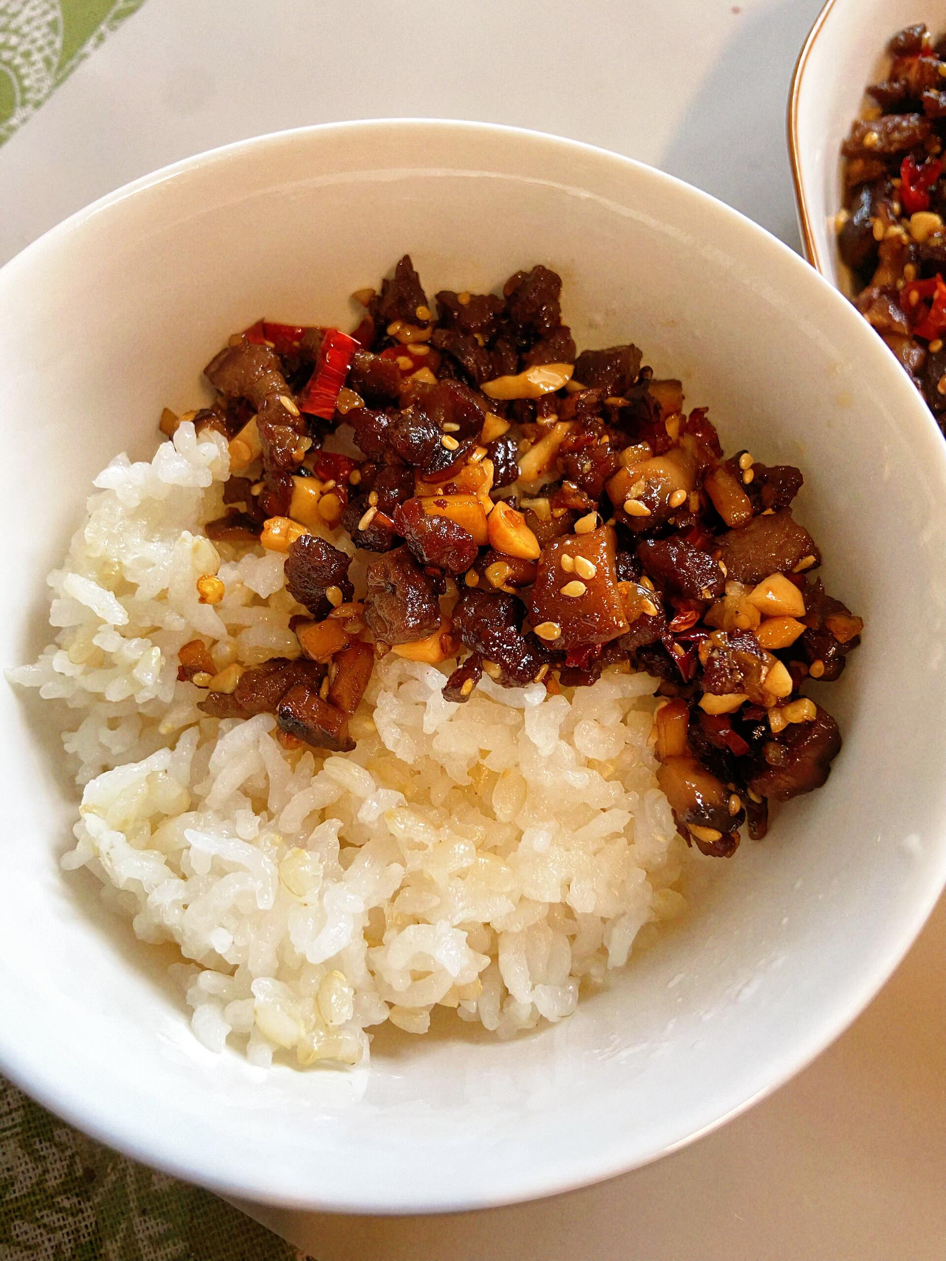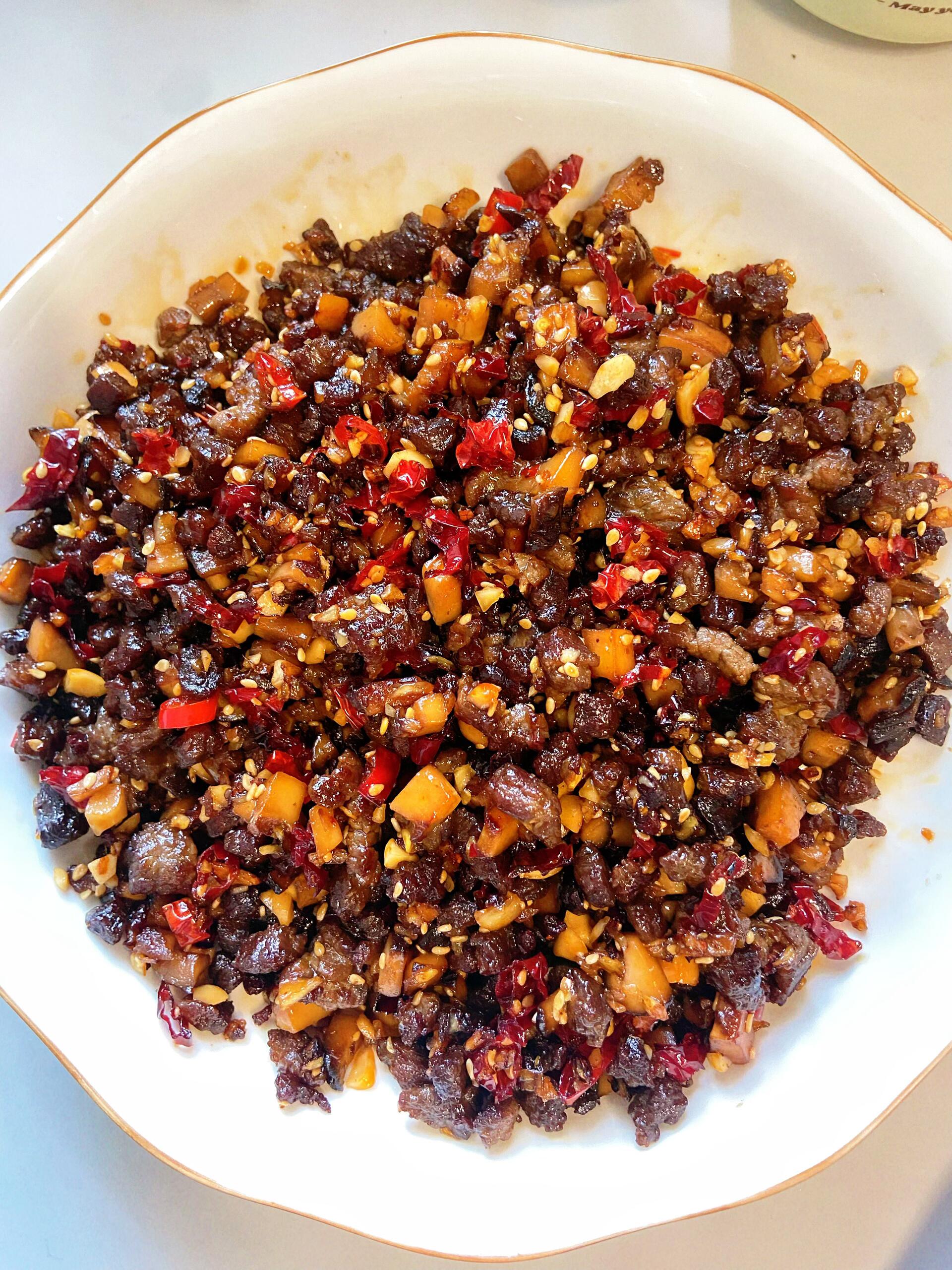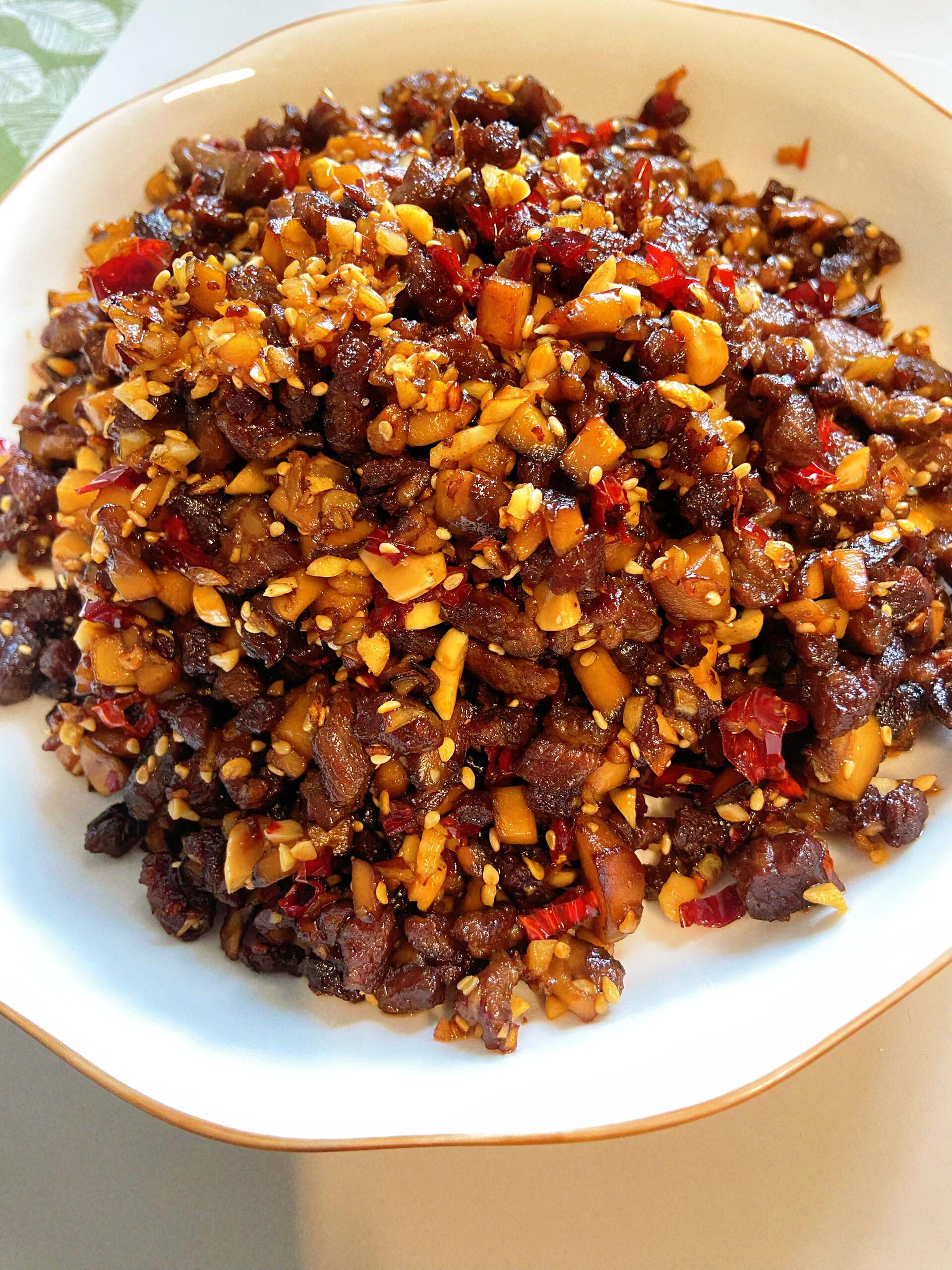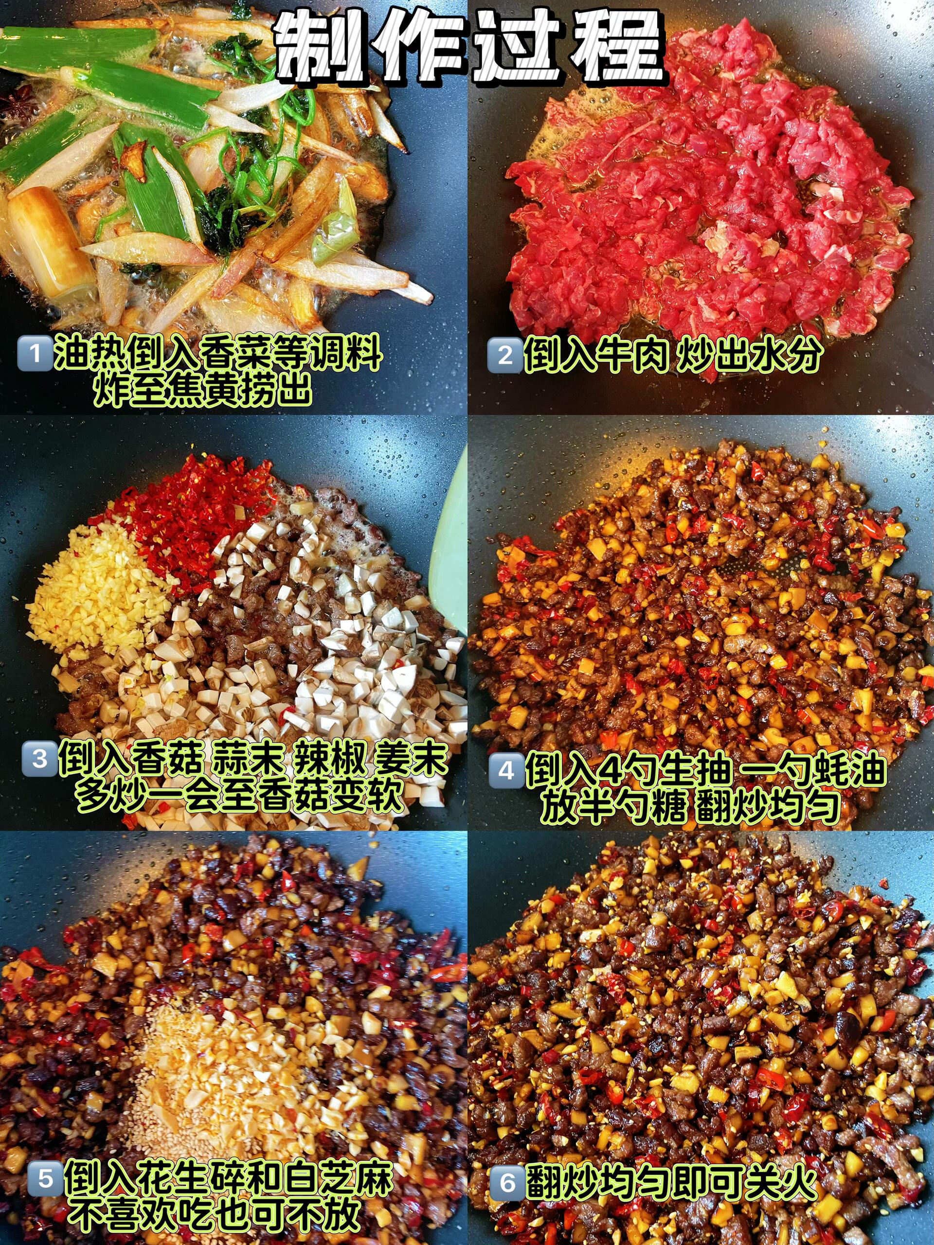 香辣牛肉粒✨越嚼越香,拌米饭直接炫3碗 谁能拒绝一碗香辣过瘾的牛肉粒啊!一口一个,越嚼越香,鲜辣不呛喉,香到停不下来,我直接炫了3碗大米饭~ 没有复杂的操作,家常做法,新手也能轻松复刻,牛肉粒紧实不柴,吸饱了浓郁的香辣汤汁,搭配软嫩香菇,口感层次拉满,不管是当菜配饭,还是当解馋小食都合适。 做法简单,食材也都是家常好买的,收藏起来,你也赶快试试,做完绝对不后悔,妥妥的下饭神器! 👉 右划有图文教程👉 🌺 香辣牛肉粒 文字版教程👇 ~~~~~~~~~食材准备~~~~~~~~~ 1️⃣ 450克牛腿肉,切成均匀的小丁 2️⃣ 5朵鲜香菇,洗净切丁 3️⃣ 1棵香菜、半个洋葱、8片姜、1粒八角、半勺花椒、大葱叶和1段葱白、4片香叶 4️⃣ 10瓣蒜、10片姜、10个不辣的干辣椒、6个小米辣(能吃辣的可以多放小米辣) ~~~~~~~~~制作过程~~~~~~~~~ 1️⃣ 锅中倒油,油热后,倒入香菜、洋葱、姜片、八角、花椒、大葱叶、葱白和香叶,炸至食材表面焦黄,然后捞出丢弃。 2️⃣ 锅中留底油,倒入切好的牛肉丁,大火快速翻炒,炒出牛肉表面的水分,直到牛肉变得紧实。 3️⃣ 倒入香菇丁、蒜末、干辣椒、小米辣和姜末,转中火多炒一会儿,直到香菇变软,炒出香菇的鲜味和辣椒的香味。 4️⃣ 加入4勺生抽、1勺蚝油,放半勺白糖提鲜,开大火快速翻炒均匀,让每颗牛肉粒都均匀裹上调料。 5️⃣ 倒入适量花生碎和白芝麻(不喜欢吃的可以不放),继续翻炒。 6️⃣ 翻炒均匀后,即可关火,盛出装盘就能吃啦。