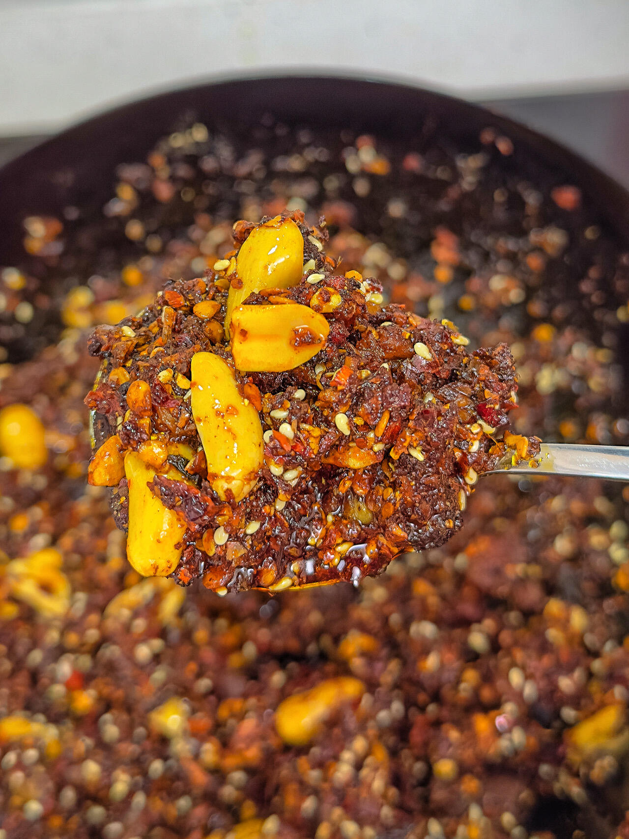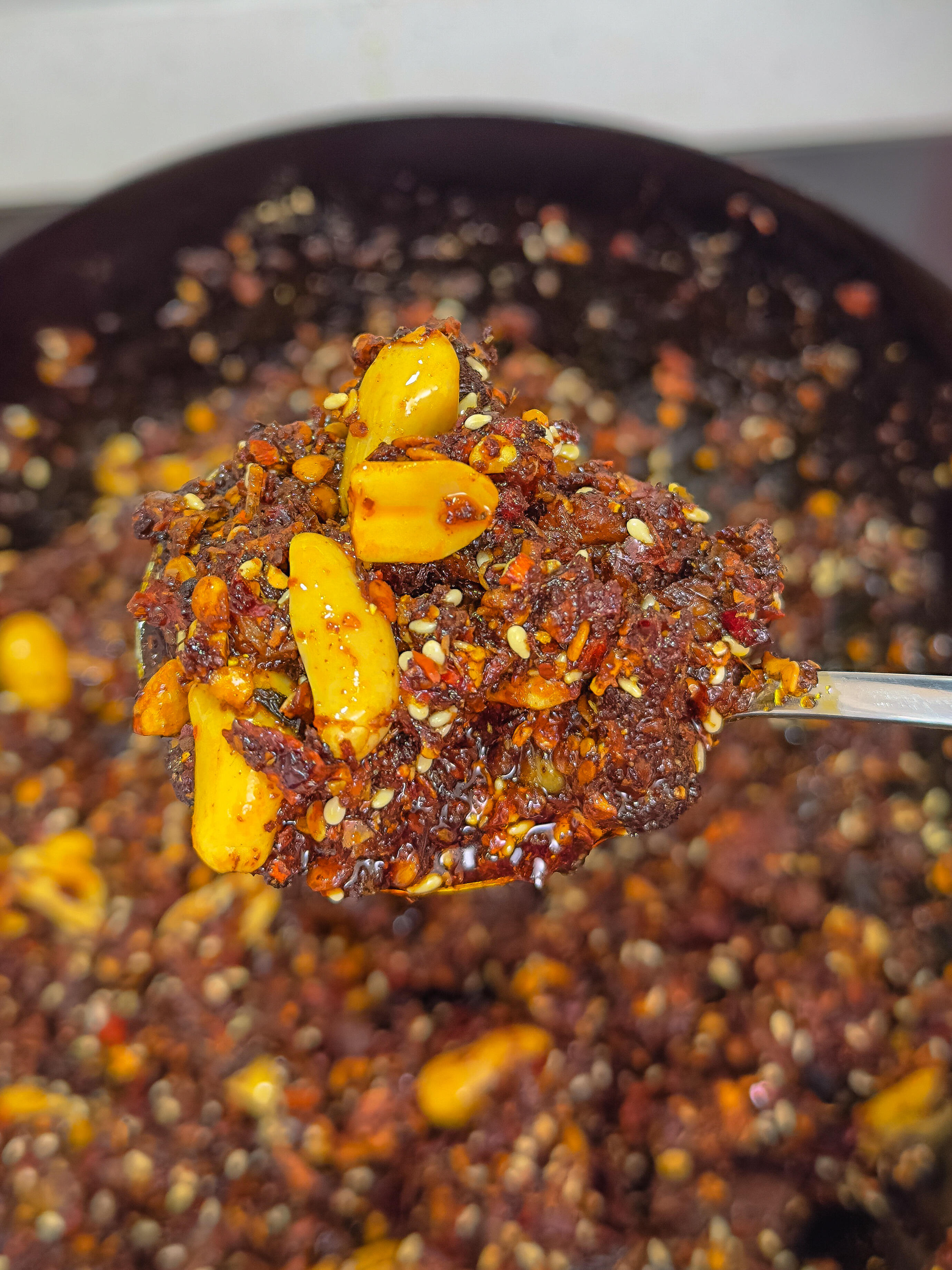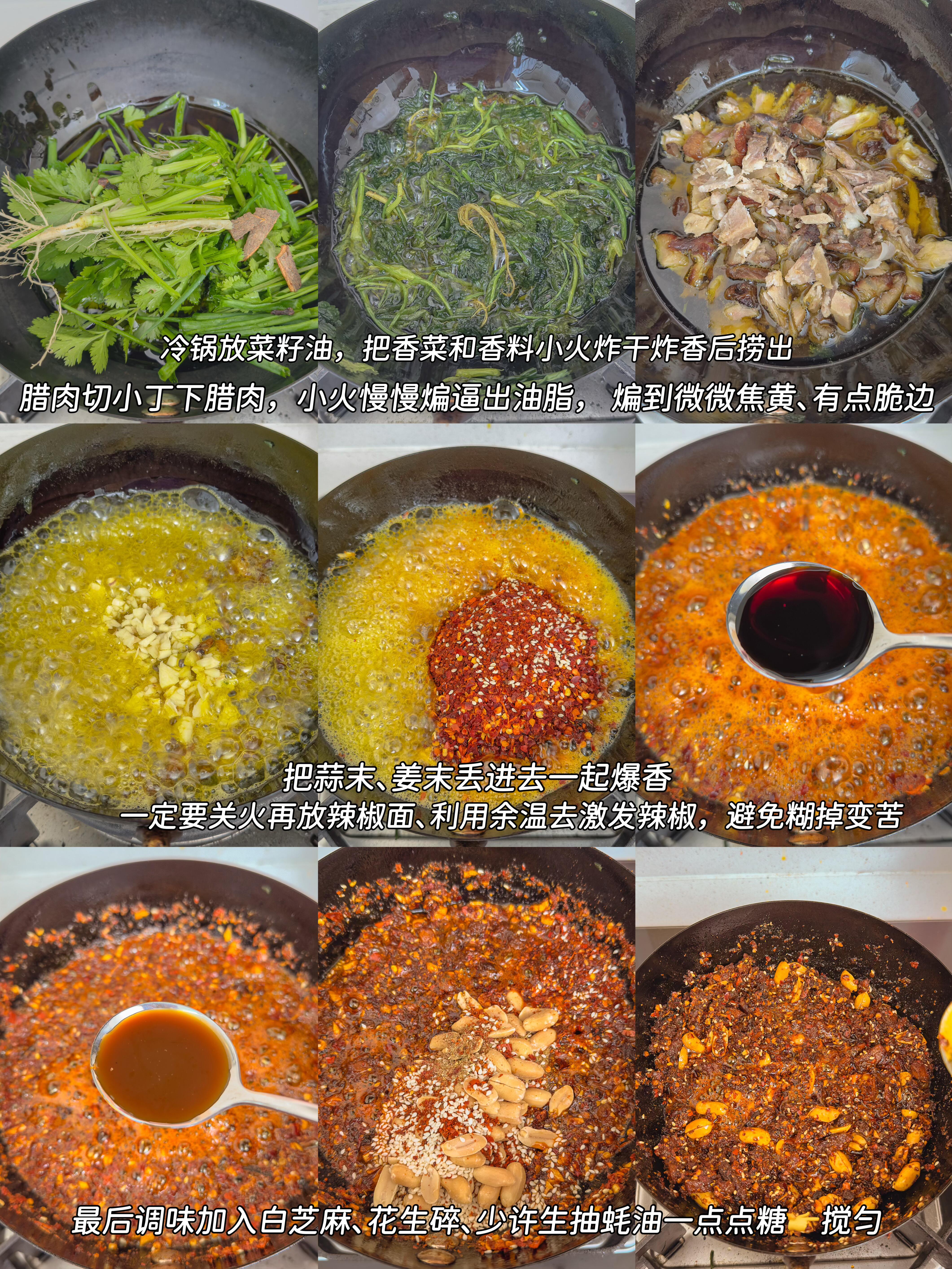 贵州风味腊肉油辣椒✨拌白米饭都能炫两碗 家里有腊肉的宝子,一定要试试做这罐腊肉油辣椒!香到骨子里,哪怕是白米饭,拌上一勺都能吃两碗🍚 现在正是吃腊肉的季节,随手做一罐腊肉油辣椒,一秒解锁贵州风味,不管是做饭、拌粉、拌面,加一勺进去,瞬间提升风味,好吃到停不下来! 它比普通油辣椒味道更厚重,自带腊肉的烟熏香,混着辣椒的鲜辣和油脂的醇香,三层风味叠加,回味悠长,不管是拌什么都巨香,家常必备! 🧾 食材清单: 腊肉、干辣椒(粗细搭配)、白芝麻、花生、花椒面、姜末、蒜末、蚝油、白糖(一点点)、生抽、八角、桂皮、香菜、菜籽油 🔥 详细做法,新手也能零失败: 1. 冷锅倒入适量菜籽油,放入香菜、八角和桂皮,开小火慢慢炸,炸至食材干香、表面微微焦黄,捞出丢弃,只留锅中的香料油。 2. 腊肉切成均匀的小丁,如果腊肉比较咸,先用水煮一遍去咸,捞出沥干;把腊肉丁放入香料油中,小火慢慢煸炒,逼出腊肉本身的油脂,煸到腊肉丁微微焦黄、边缘有点酥脆就可以。 3. 放入姜末和蒜末,转小火继续翻炒,炒出姜蒜的香味,和腊肉的油脂香充分融合。 4. 关键一步!一定要先关火,利用锅中的余温放入辣椒面,快速翻炒均匀,这样能充分激发辣椒的香味,还能避免辣椒面炒糊变苦。 5. 最后进行调味,加入白芝麻、花生碎、少许生抽、适量蚝油,再放一点点白糖提鲜,用筷子充分搅匀,放凉后装入密封罐,随取随用。 这款腊肉油辣椒,自带烟熏香+鲜辣+油香三层味道,回味悠长,拌粉、拌面、拌米饭、拌凉菜都巨绝,哪怕光用它拌白米饭,都能轻松炫两碗,家里有腊肉的赶紧安排!