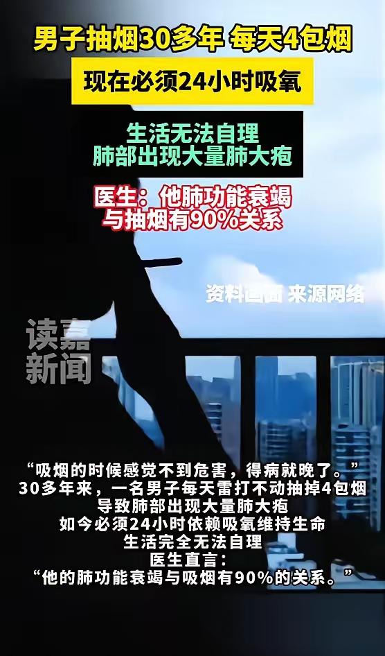 “悲剧还是发生了!”河南郑州,一男子是为老烟民,30多年来,每天平均吸4包烟,最后身体不舒服去医院检查,没想到他的双肺已布满肺大疱,如今,男子必须24小时依赖吸氧维持生命,连最基本的吃喝拉撒都需要家人协助!网友:太吓人了 这事儿看得人后背发凉。一天4包烟,30多年算下来,将近45000支烟草就这么一口一口吸进了肺里。医生说得很直白,他这肺功能的损伤,90%跟抽烟脱不了干系。一支接一支,肺泡壁哪扛得住这种折腾,破裂、融合,最后就剩下满肺没用的“大空泡”。 说句难听的,这哪是抽烟,这简直是在拿自己的肺当烟囱使。现在吃喝拉撒都得靠人伺候,活生生把自己困在了那根两米长的氧气管里。有人说这是“温水煮青蛙”,可这锅温水,明明就是自己一锅一锅烧开的。 很多人觉得只要没得癌就烧高香了,那是真没见识过慢阻肺和肺大疱的厉害。这病比癌症还磨人,让你清醒着感受每一次呼吸的绝望。走几步路就喘得像被人掐住脖子,到最后连说句完整的话都费劲。活着,但毫无生活质量可言,这比一刀毙命残忍多了。有研究数据摆在那里,老烟枪里得慢阻肺的比例高得吓人,几乎九个里面就跑不掉一个。 我注意到网友评论里有句话特别扎心,说是“哪怕每天只抽一包,也是在拿命赌博”。这话一点不夸张。一根烟里有七千多种化学物质,哪怕只是少量进入血液,对血管内皮的损伤都是不可逆的。日积月累,就算肺勉强撑住了,心脑血管也迟早得拉响警报。 也别拿什么“隔壁王大爷抽了一辈子也活到九十多”来抬杠。个案代替不了大数据,医学统计显示吸烟者患肺大疱的风险是非吸烟者的2到3倍。拿个例当真理,跟闭着眼闯红灯有啥区别?罚单没开到你头上,不代表规则不存在。 现在咱们把话说回郑州这位大哥。他躺在床上不能动的样子,就是给所有心存侥幸的烟民敲的一记警钟。戒烟这回事,说再多健康道理,都不如一张CT片子来得有说服力。 各位读者你们怎么看?欢迎在评论区讨论。