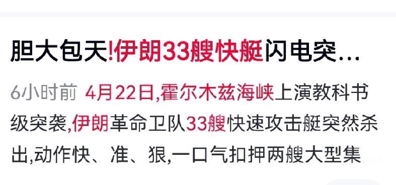霸气完胜!伊朗33艘快艇奇袭,美军眼睁睁看控制权易手 4月22日,霍尔木兹海峡爆发震撼一幕!伊朗革命卫队出动33艘高速攻击快艇,发动闪电突袭,强势扣押两艘违规货船。美军在此设有全天候监控,却未能拦截,眼睁睁看着伊方完成控制,场面极度解气! 快艇从沿海500米深的地下洞库出击,混入渔船规避雷达,以50节时速极速逼近,几分钟内完成包围、登船、扣押,动作干脆利落。被扣船只一艘关联以色列,一艘为美方关注对象,美国火速辟谣与己无关,尽显尴尬。 伊朗依托复杂地形与非对称战术,彻底克制了美军巨型舰艇的优势。此次行动直接引爆能源市场,WTI原油暴涨4.36%至97美元/桶。这不仅是一次扣船事件,更是伊朗宣告“霍尔木兹由我说了算”的硬核宣言! 对此,你怎么看? 霍尔木兹海峡 伊朗硬核反击 美军霸权失灵