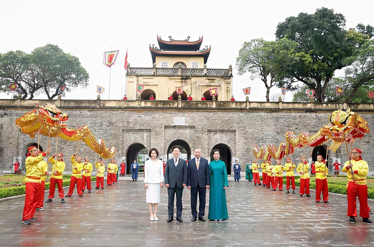 苏林夫妇陪同来访的李在明夫妇游览河内升龙皇城,在端门前合影。