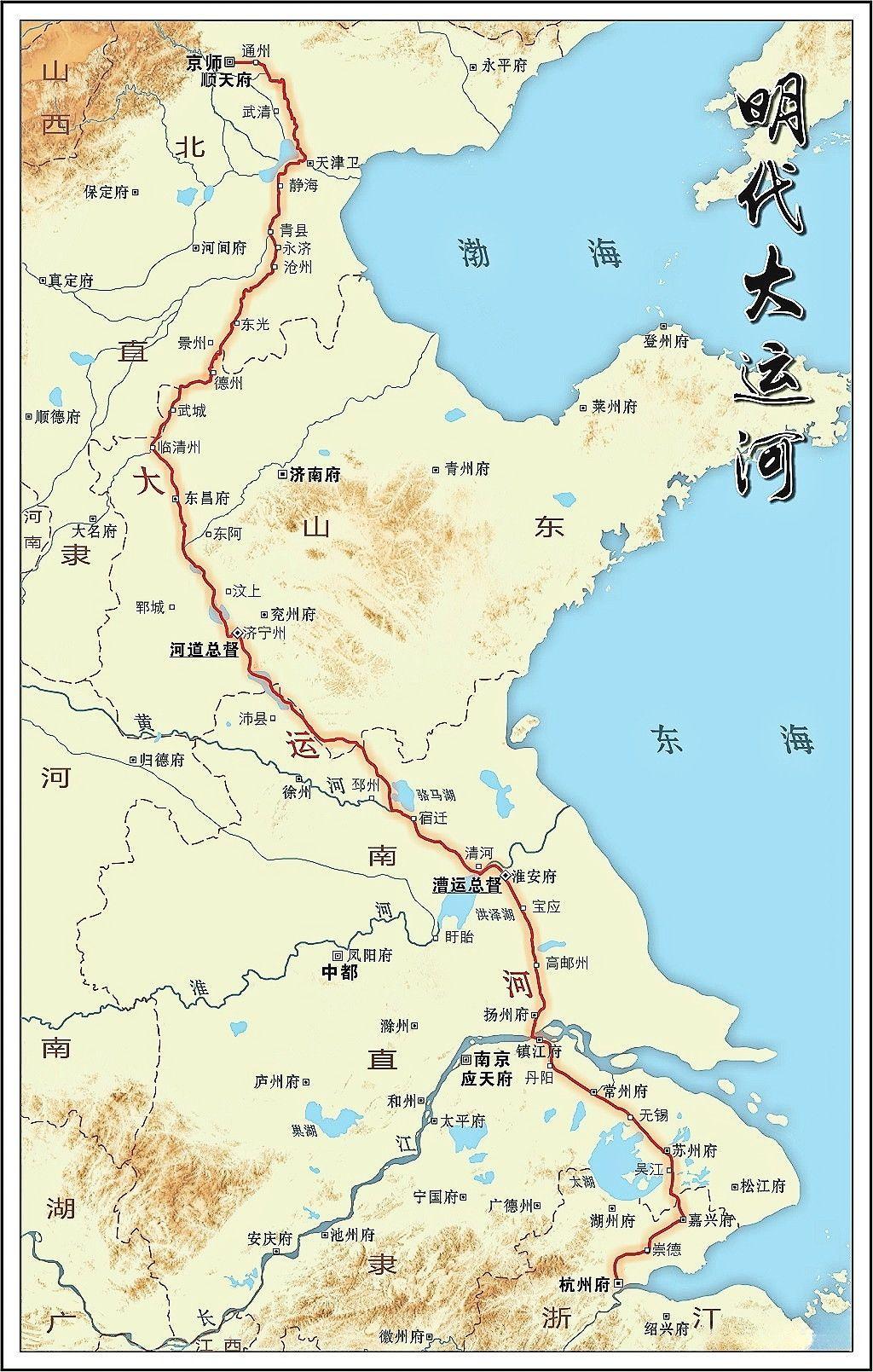 明代大运河是国家经济与漕运的生命线,在永乐年间全面疏浚贯通,成为明清两代南北交通与物资调配的核心通道。 一、基本走向与分段 明代大运河全长约3000余里,自杭州至北京大通桥,分六大段 : 1. 江南运河:杭州—镇江,通长江 2. 江淮运河(邗沟):扬州—淮安,通淮河 3. 黄淮运河:淮安—徐州,借黄河行运 4. 会通河:徐州—临清,山东段(水脊,明代治理核心) 5. 卫河(御河):临清—天津 6. 通惠河:天津—北京,通都城 二、关键治理工程(永乐朝) - 南旺分水枢纽(白英、宋礼) 会通河是全河最高点(水脊),元代水源不足、常淤塞。 永乐九年(1411)建戴村坝拦汶水,开小汶河引至南旺,设石碣分水:七分北流、三分南流,彻底解决水源问题。 配套建水柜(水库)与密集闸坝,会通河成为“闸漕” 。 - 通惠河疏浚 修复元代郭守敬旧道,引昌平、西山诸泉入北京,漕船可直达积水潭。 三、漕运规模 成化八年(1472)定岁运漕粮400万石,为明初6倍。漕船约1万余艘,运军12万人,年运量稳定在300–400万石。 四、管理体系 总漕(漕运总督):驻淮安,掌漕运、催粮、运军。 总河(河道总督):驻济宁,成化七年(1471)设,掌河道疏浚、闸坝、防洪。 五、历史作用 政治:保障迁都北京后的京师粮食与物资供给,巩固北方统治 经济:南北物资大流通,催生临清、淮安、扬州、苏州、杭州、天津等运河城市 文化:促进南北文化、技术、人员交流,形成运河文化带。 地理 历史 大运河
