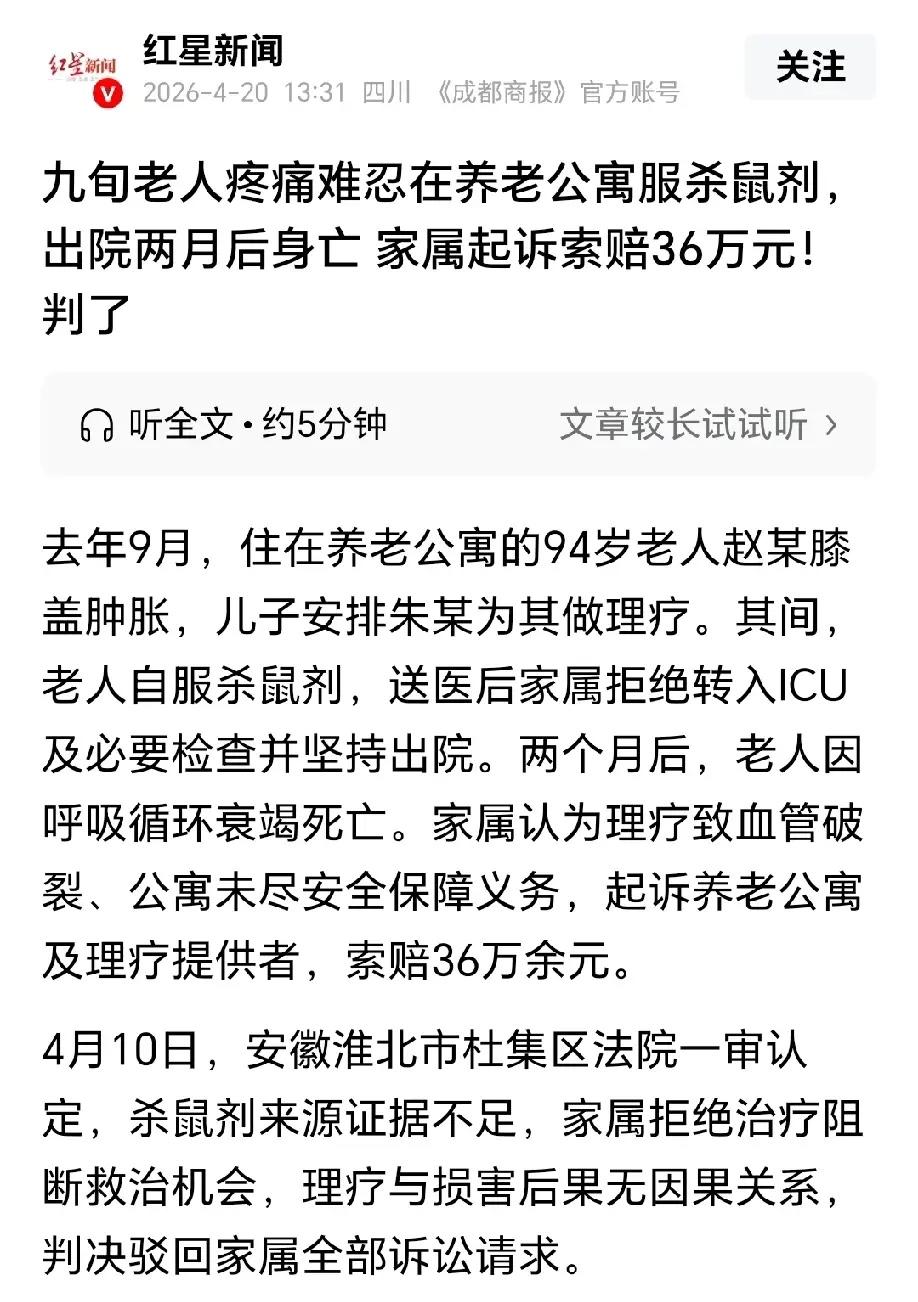 想钱想疯了吧!安徽淮北,94岁老人入住养老院,因膝盖肿胀有积液,儿子邀请朋友为其做理疗。理疗后,老人的病痛并没有缓解,受不了病痛的折磨,她偷偷服用了杀鼠剂。送医后,两个儿子拒绝将老人转入ICU,更不按照医生建议进行检查,还坚持要求出院。两个月后,老人身亡,两个儿子却把养老院和理疗的朋友的告上法庭,索要36万元的赔偿。法院这样判! 这事发生在淮北市杜集区,2024年8月李某乙把93岁的母亲赵某送进了一家养老公寓,当时老人身体还行,测评结果是生活能自理。到了2025年9月,老人膝盖肿得厉害,里面还有积液,疼得受不了。大儿子李某甲看着心疼,就找了个熟人朱某,到公寓给母亲做理疗,想帮她缓解疼痛。朱某是出于情谊,免费帮忙的。 理疗做了疼痛没见好,老人实在熬不住,不知道从哪弄来了杀鼠剂,自己偷偷喝了大概10毫升,她想一了百了。几天后老人走路摔了一跤,被送进医院。一开始医生以为是摔伤,治着治着才发现不对劲。 转到另一家医院老人才说实话,自己十天前喝了老鼠药。病历上写着杀鼠剂中毒、凝血障碍、呼吸循环衰竭,情况非常危险,随时可能没命。医院医生急得不行,反复跟两个儿子沟通。老人必须马上转进ICU抢救,还要做抽血、CT这些必要检查。可兄弟俩商量来商量去,就是不同意。他们说不出理由,就是坚持不转ICU,也不让做检查。 拖到10月3号兄弟俩直接给老人办了出院手续,硬是把人接回了家,医生拦都拦不住。2025年12月2日94岁的老人走了,死亡证明上写的是呼吸循环衰竭。 人都没了该伤心难过吧?可这兄弟俩接下来的操作,让人看不懂了。他们一纸诉状,把养老公寓和帮忙理疗的朱某一起告上了法庭。开口就要三十六万零六十九块五毛的赔偿。 他们的理由是朱某理疗不当,把老人血管弄破了,才疼得自杀;养老公寓没看管好,让老人拿到杀鼠剂,没尽到安全责任。反正,母亲的死,都是别人的错。 养老公寓觉得冤,根本没证据证明杀鼠剂是公寓里的。理疗是家属自己找的人,跟公寓没关系。朱某更委屈,好心免费帮忙,倒帮出官司来了。 淮北市杜集区法院开庭审理后给出了两点解释:杀鼠剂来源说不清不能怪养老院,医院明确要求抢救,家属硬是拒绝,自己断了救治的路。理疗和服毒,也没有证据证明有因果关系。 2026年4月10日,法院一审判决驳回兄弟俩的全部诉讼请求,一分钱都不赔。法院说家属不配合治疗,“该行为阻断了可能存在的救治机会,由此发生的后果应自负。” 九十四岁的母亲,疼得喝老鼠药,那是绝望到什么地步。作为儿子,最该做的是不惜一切代价救她,而不是算计着怎么从她的死里捞一笔钱。 疼痛不是理疗给的,绝望却是亲人加的。当生命被标上价码,亲情就变了味。老人喝下的那10毫升,不是毒药,是她对疼痛和冷漠的最后控诉。 法院的判决,不只是驳回了三十六万的索赔,更是驳斥了一种扭曲的逻辑。别把算盘打到至亲的生死上,这钱,拿着烫手,更烫良心。 各位读者你们怎么看?欢迎在评论区讨论。