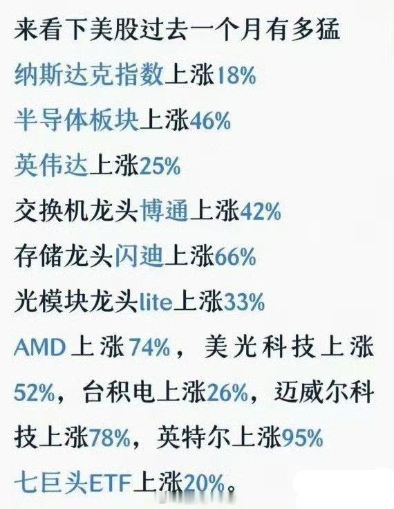 今天休息本来不想说股市,但老美科技股太疯狂了!费城半导体指数涨4.32%,已经走出18连涨;本周累计上涨10%,本月已经上涨38.5%!其中,英特尔大涨23.6%,AMD大涨14%,英伟达涨超4%。这么一对比,我们易中天+宁德的涨幅有点小儿科啊。美股为啥这么火爆?第一、英特尔业绩大超预期,带动半导体狂飙;第二、美伊有望展开谈判以结束战争;第三、美国司法部终止调查鲍威尔,这个有望提振降息预期!这些都利好科技股,所以又火上浇油了。别人家股市要么就是新高,要么调整一下继续新高的路上。可我们大A就是容易犯恐高症,涨一点就战战兢兢,周四周五已经连跌2天了。下周应该给点力了,让散户赚点钱,也给4月行情画上一个好的句号吧!大家赚钱五一就可以去消费了,为刺激内需做贡献嘛。财经a股