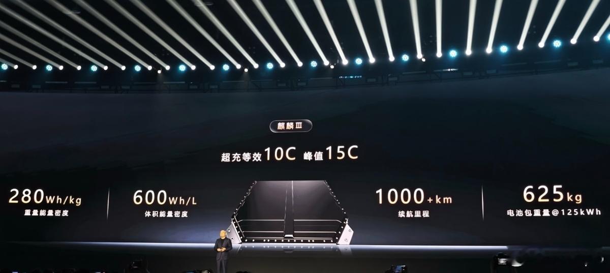 第三代麒麟三元锂电池重量能量密度达 280Wh/kg,体积能量密度600Wh/L,125kWh 电池包仅重625kg。