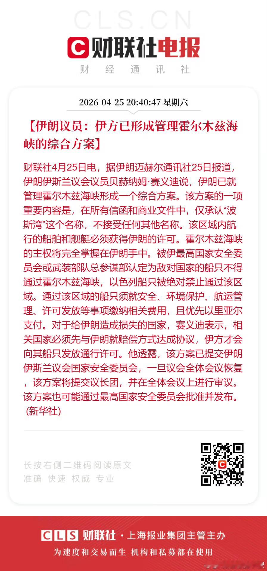 伊朗议员:伊方已形成管理霍尔木兹海峡的综合方案。