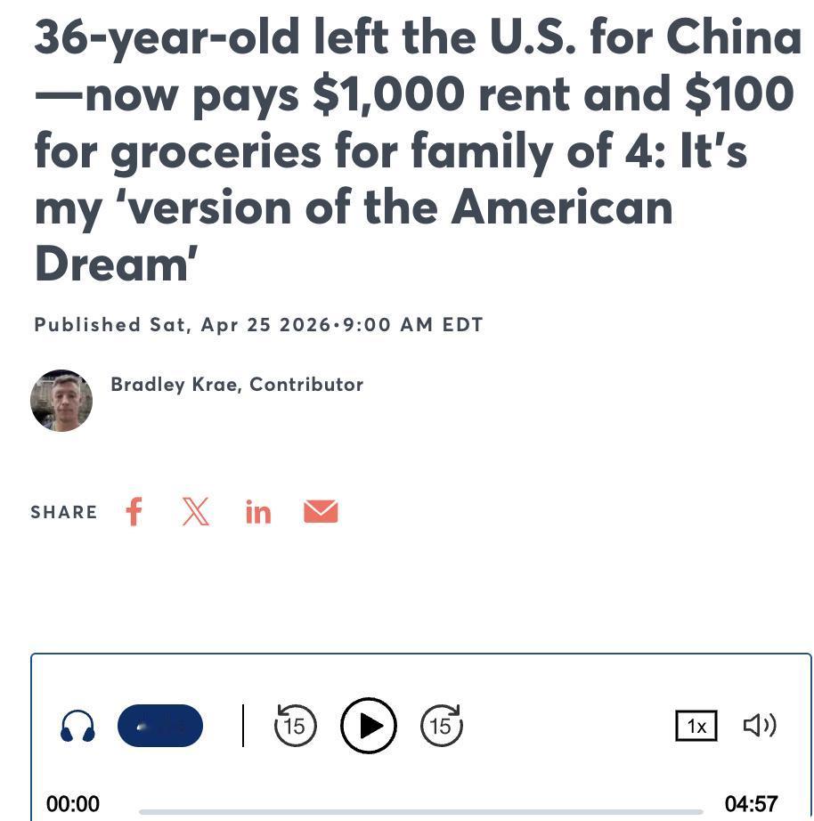 美媒:36岁美国人移居深圳:月租1000美元,养家仅需百元 布拉德利·克雷,36岁,曾在美国多个州辗转生活。2016年,27岁的他只身前往深圳担任英语教师,开启了人生的转折。如今,他与妻子(出生于大溪地、父母均为中国人)及两个孩子定居深圳,称这是"我的美国梦"。 生活成本方面,一家四口每月开销极低:三居室房租约1,000美元,网费29美元,电费约100美元,每月食品杂货仅需100美元,外出用餐鲜少超过10美元,医疗保险约90美元。总体而言,月支出仅为其单身住在美国时的四分之一。 收入方面,他曾月薪约4,000美元,转型为市场营销经理后月薪约3,500美元,加上副业月入约1,200美元。孩子就读公立幼儿园,两个孩子每学期学费(含餐费)约300美元。 他对深圳赞不绝口。无人机15分钟内送餐、自动驾驶出租车普及、地铁票价仅约0.3美元、全程无需钱包靠手机支付。城市有逾千座公园,孩子正在成长为法语、英语、普通话三语者。 他表示,最大的安全顾虑只是电动摩托车,而非枪支暴力。
