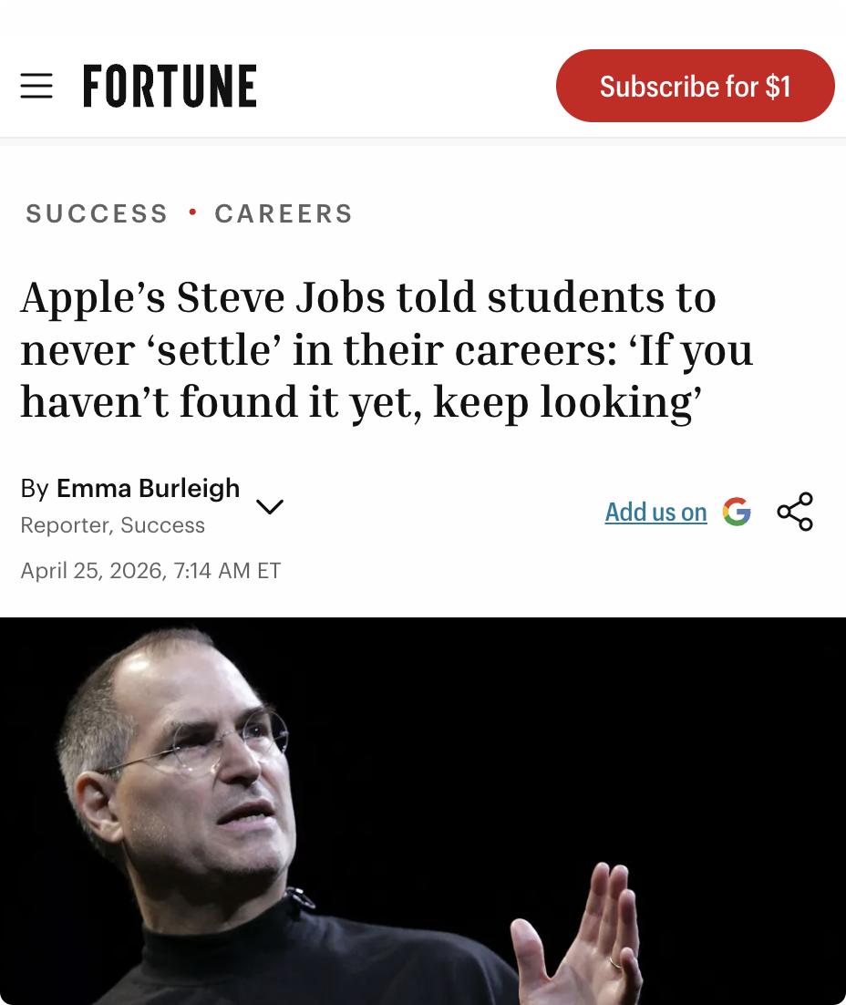 美媒:乔布斯在2005年斯坦福演讲中告诫学生不要在职业上"将就",要热爱所做的事,没找到就继续寻找。 他曾被自己创立的苹果驱逐,但凭借热爱创办了NeXT、重振皮克斯,最终回归苹果并带领其成为4万亿美元巨头。 乔布斯强调金钱并非动力,12岁时他主动联系惠普联合创始人获得零件和工作机会,这种勇气奠定了成功基础。 尽管Z世代面临AI冲击和就业市场动荡,但乔布斯近50年的职业生涯表明,追求热爱才是可持续成功的秘诀。