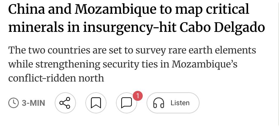外媒:中国与莫桑比克签署矿产与安全合作协议,计划在该国北部受伊斯兰叛乱困扰的德尔加杜角省开展关键矿产地质测绘,目标锁定石墨、锂和稀土等高价值矿藏,这些资源对全球绿色能源转型至关重要。 莫桑比克总统查波访华期间,两国达成共识,中方愿在基础设施、综合能源及矿产开发领域探索合作新路径。 该地区虽拥有超过5万亿立方米的鲁伍玛盆地天然气储备,但叛乱已造成超百万人流离失所,导致多个中资参与的大型项目停滞,安全挑战仍是开发的主要障碍。