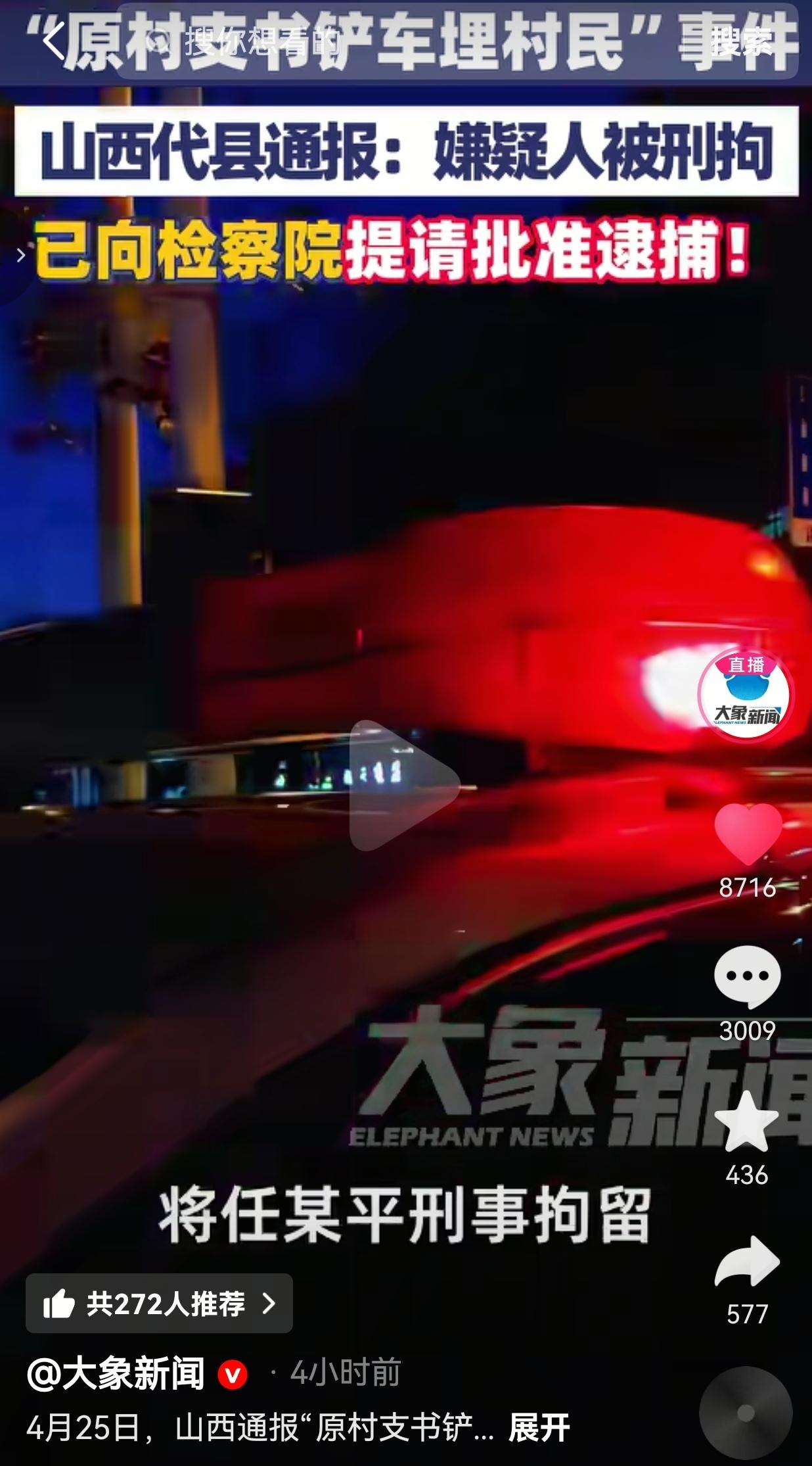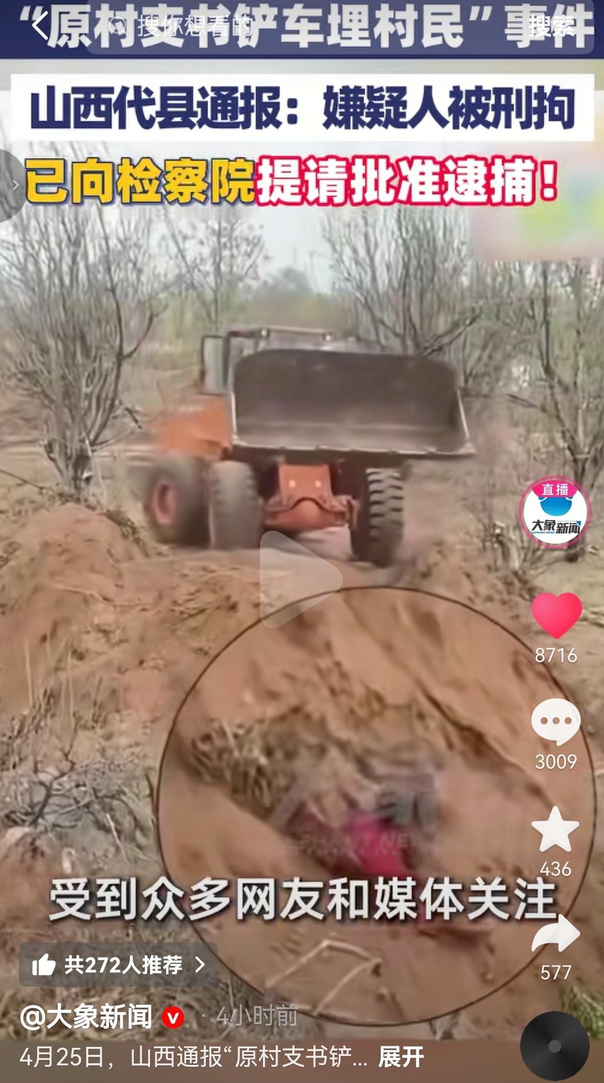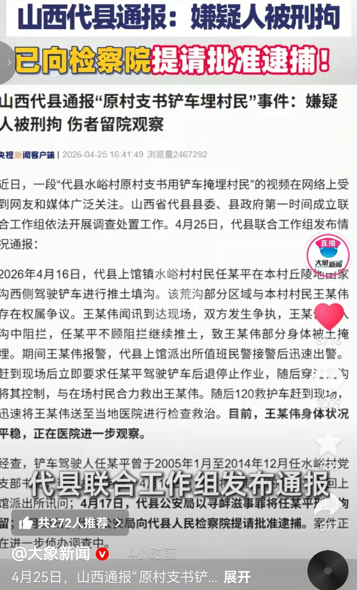 山西这起“铲车埋人”事件,看完通报我还是浑身发冷! 说真的,当看到铲车推着黄土往沟里倒,沟里的人半个身子被埋住时,我整个人头皮都麻了。 事情发生在山西代县水峪村。4月16号,原村支书任某平开着铲车,在村里的荒沟里推土填沟。这块地,跟村民王某伟一直有争议。 王某伟赶到现场拦着不让干,直接跳进沟里阻拦,俩人当场吵了起来。 可谁也没想到,任某平压根没打算停手,直接开着铲车继续往前推土,完全不顾阻拦,硬生生把王某伟半个身子埋进了黄土里。 王某伟在土里挣扎着报了警,民警赶到时,王某伟的上半身已经被黄土埋得只剩一点。 民警冲过去喊停,穿过荒沟合力才把人从土里挖了出来,送进医院时人已经吓得瘫软。 而开铲车的任某平,被抓后居然轻描淡写,只说一句“没什么大事”,可他忘了,王某伟在土里被埋的那几分钟,每一秒都可能没命。 4月17日,代县公安局以寻衅滋事罪将任某平刑拘;4月23日,已向检察院提请批准逮捕。通报里写得清清楚楚,可我看完还是觉得,这哪里是普通纠纷?分明是拿普通人的性命当草芥! 网友看到后评论说:这哪是铲车推土啊,这分明是往绝路上逼!以前当支书就这么横,卸了职还敢这么干,平时为人得有多霸道! 也有的网友说:开铲车的都知道,人一旦被土埋住根本爬不出来,泥土越压越重,几分钟就能窒息遇险!这行为恶劣至极,完全漠视他人生命! 还有的网友说:我现在浑身发冷,要是民警晚到几分钟,这人还有命吗?对着一个活生生的邻居,怎么能下得去这种狠手? 更有网友表示:寻衅滋事的定性未免太轻了!当众用铲车埋人,放任危险发生,这件事的恶劣程度,根本不能一概而论! 说实话,一个曾经担任村干部的人,手握作业机械,面对邻里土地纠纷,竟然能狠心开着铲车埋人。他心里压根就没想过好好沟通、合法解决问题,满脑子都是仗势欺人,想用极端手段压服对方。 王某伟被困土沟里的那一刻,该有多无助和绝望?眼睁睁看着泥土不断盖在自己身上,对方却没有丝毫收手的意思,那种孤立无援的恐惧,足以留下一辈子的心理阴影。 可更让人心寒的是,官方通报将此事定性为权属争议引发的争执。这话听着格外窝火! 日常争执,顶多是口角矛盾、肢体拉扯,怎么也不可能升级到动用重型机械、活埋他人的地步。 这种行为,早就超出了争执的范畴,是毫无底线、漠视生命的恶劣恶行。 很多人感慨,长期身居高位养成的强势做派,很难轻易改掉。往日里习惯了说一不二,没人敢反驳,即便不再任职,骨子里的蛮横与傲慢依旧存在,妄图用强硬手段解决所有矛盾。 但要明白,人情有尺度,法律有底线,没有人可以凌驾规则之上,更没有人能随意践踏他人的生命安全。 万幸的是,王某伟躲过一劫,被及时救下,目前身体状况平稳,在医院接受观察。 可这只是侥幸,一旦救援稍有延迟,一场无法挽回的悲剧就会就此上演,两个家庭都会彻底被毁。 土地纠纷、利益矛盾,在生活里随处可见,全都有合法合理的解决渠道。 再大的矛盾、再深的隔阂,都不能成为伤害别人的理由,更不能拿性命去赌气、去较劲。 一旦选择用暴力和极端方式解决问题,毁掉的不仅是别人,更是自己的人生和未来。 最后,我想说的是:你可以霸道一时,但永远逃不过法律的约束;你能用黄土掩盖一时的过错,却永远埋不掉骨子里的冷漠与恶。 对此,你怎么看? 来源:大象新闻