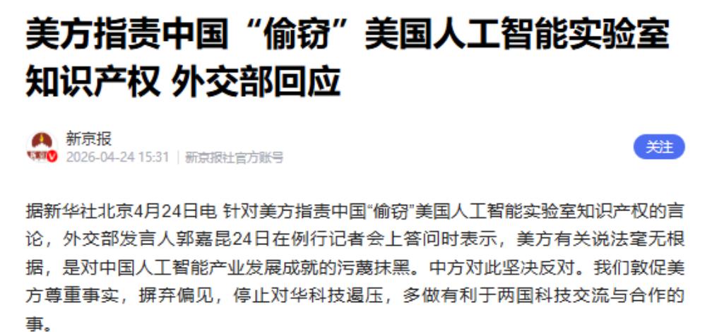 中国外交部发布严正声明!4月24日,对于美国指责中国窃取美国人工智能(AI)实验室知识产权的言论,中国外交部强调,美方的说法毫无根据,并反对美国污蔑中国AI产业发展成就。 此次,美国借Anthropic公司发难,无端宣称DeepSeek等中国企业采用“工业级蒸馏攻击”手段,窃取其Claude模型技术,这种无端指责实在是毫无根据。 此事着实经不起仔细推敲,知识蒸馏本就是AI领域的“常规操作”,早在2015年,Hinton先生便已提出此项技术,且全球企业皆在运用,又怎会沦为“偷窃”之举呢。 更具戏谑意味的是,Anthropic自身也是“泥足深陷”,2025年,它因用盗版书训练模型赔付15亿美元,2026年,又因下载2万首歌曲遭音乐公司起诉,面临30亿美元索赔。 这波“贼喊捉贼”,自己先露了馅。 中国AI的崛起可不是“偷”来的,是实打实自主创新的成果,数据说话:中国AI企业超6000家,核心产业规模破1.2万亿,国产开源大模型下载量超100亿次,AI专利占全球60%。 拿DeepSeek来说,人家搞的NSA稀疏注意力机制,通过优化模型架构,在算力不够的情况下还能让性能“起飞”,天数智芯的AI芯片,专门适配工业场景,在工厂里用得贼溜。 这些突破证明:当美国想用芯片禁令卡我们脖子时,我们反而在“场景倒逼创新”里杀出了一条“轻模型、高效率、低成本”的新路子。 美国这波操作,本质是科技霸权焦虑症犯了,从《芯片与科学法案》到“小院高墙”式封锁,美国总想用非市场手段维持技术垄断,可历史早告诉我们:技术封锁从来封不死后来者。 昔日,英国封存蒸汽机,未曾料到美国借此掀起工业革命浪潮,而后,苏联投身航天竞赛,无心插柳间,竟有力推动人类实现登月壮举,为科技史添上浓墨重彩的一笔。 现在,中国在稀土提炼、RISC-V开源生态、工业AI等领域都实现了突破,美国所谓的“窃取”指控,不过是掩盖自己创新乏力的遮羞布。 真正的科技竞争,应该是公平、开放、合作的,中国从来没否认和美国有技术差距,但差距缩小靠的是自主创新的定力,不是“偷”。 当美国政客沉迷“科技种族优越论”时,中国科研人员正默默攻克“卡脖子”难题,当美国企业忙着打官司、搞封锁时,中国企业已经把技术用到了全球100多个国家。 未来的科技博弈,不该是“你死我活”的零和游戏,而该是“美美与共”的创新生态,只有摒弃偏见、尊重事实,AI技术才能真正造福人类,这,才是大国该有的科技伦理和战略智慧。