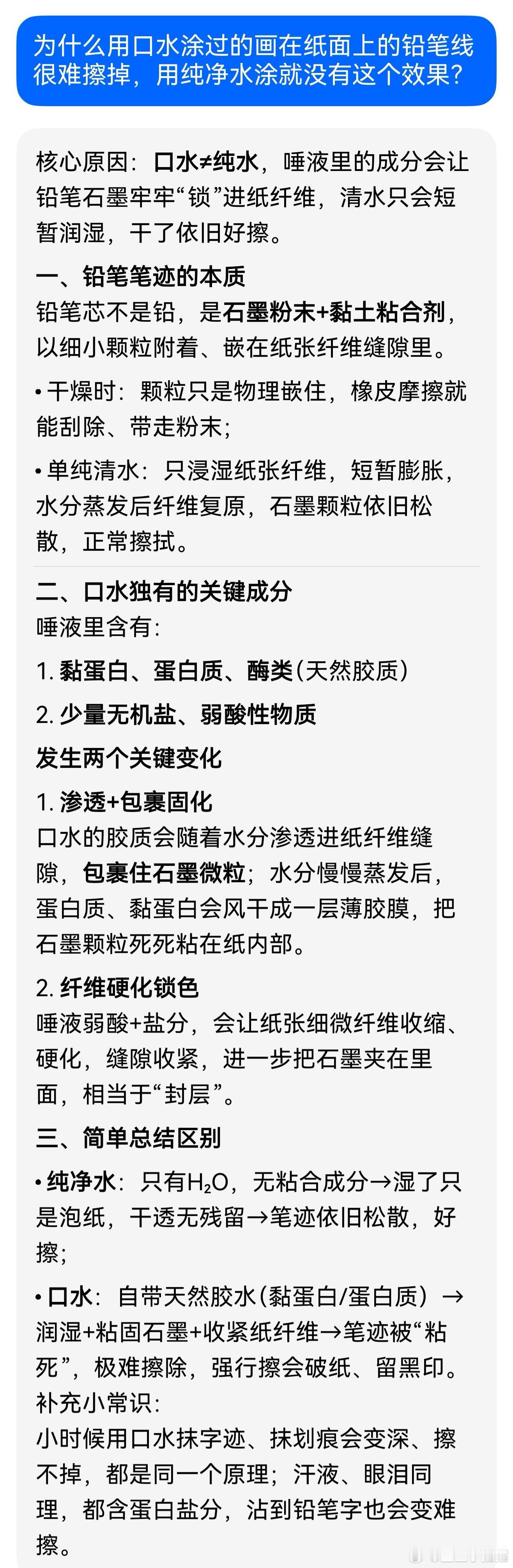 逗比小孩 晚上放学,鱼大姐兴奋地给我展示她的新发现:发现铅笔印,单独擦很好擦掉,遇水之后清洁难度大一点,然后她吐了滴口水摸上去,发现很难擦下来。一定是口水里有啥物质和碳反应了。嗯,她对这一发现很满意,可能以为自己即将获得搞笑诺贝尔奖了……