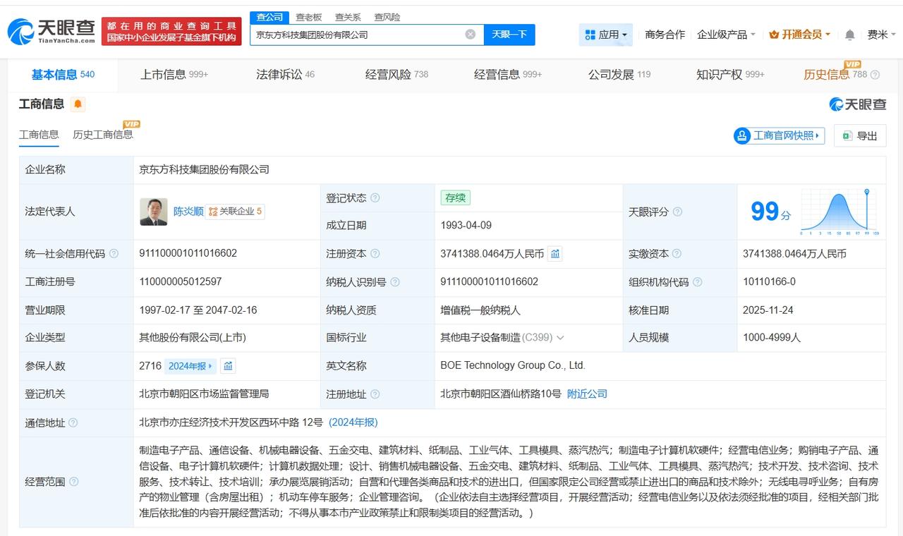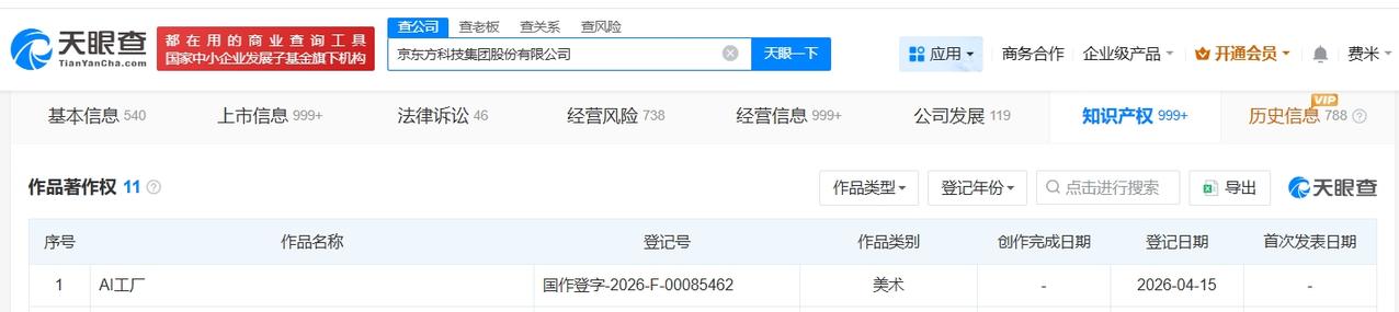 京东方申请注册AI工厂商标 天眼查知识产权信息显示,近日,京东方A(000725)申请注册多枚“京东方 AI工厂”“AI 工厂”“BOE AI工厂”商标,国际分类涉及科学仪器、网站服务,当前商标状态均为等待实质审查。值得一提的是,近期,该公司还登记了“AI工厂”作品著作权,作品类别为美术。 京东方科技集团股份有限公司成立于1993年4月,法定代表人为陈炎顺,注册资本约374.1亿人民币,经营范围包括制造电子计算机软硬件、经营电信业务、计算机数据处理等,由北京国有资本运营管理有限公司、香港中央结算有限公司、北京京东方投资发展有限公司等共同持股。 天眼查信息: