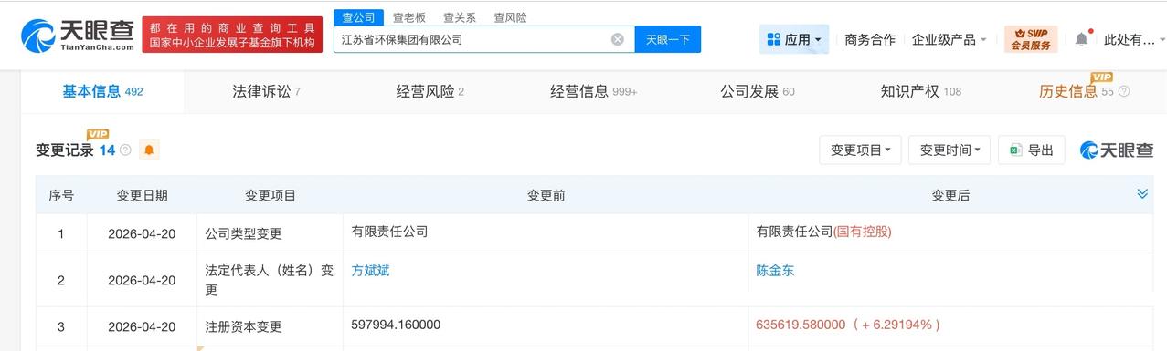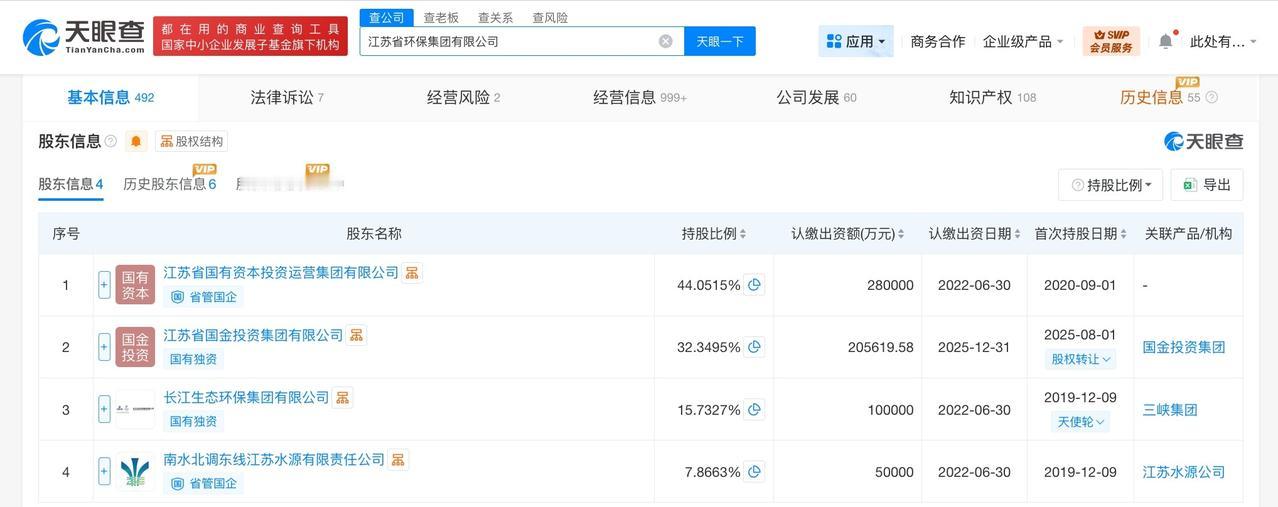 江苏省环保集团增资至63.6亿 增幅约6% 天眼查App显示,近日,江苏省环保集团有限公司发生工商变更,注册资本由约59.8亿人民币增至约63.6亿人民币,增幅约6%。 该公司成立于2019年12月,法定代表人为陈金东,经营范围包括环境基础设施、环境综合治理与生态保护修复工程的投资、建设和运营管理,环保新技术、新产品、新设备研发推广和生产经营,资源循环利用及绿色产业投资等,由江苏省国有资本投资运营集团有限公司、江苏省国金投资集团有限公司、长江生态环保集团有限公司、南水北调东线江苏水源有限责任公司共同持股。 天眼查信息: