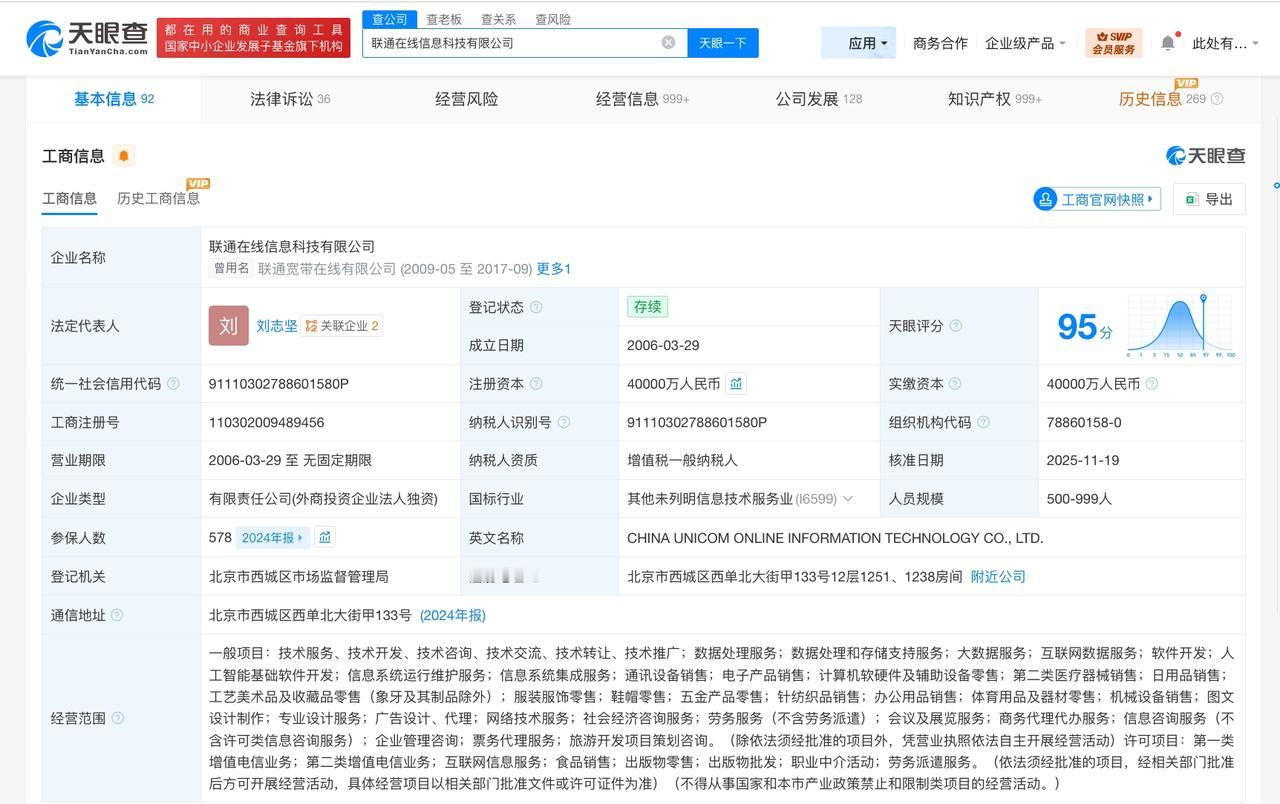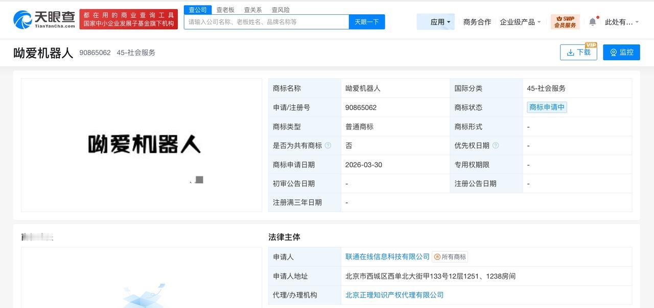 联通在线申请注册呦爱机器人商标 联通子公司申请机器人商标 天眼查App显示,近日,联通在线信息科技有限公司申请注册多枚“呦爱机器人”商标,国际分类包括通讯服务、运输贮藏、社会服务等,当前商标状态均为等待实质审查。 联通在线信息科技有限公司成立于2006年3月,法定代表人为刘志坚,注册资本4亿人民币,经营范围含数据处理服务、数据处理和存储支持服务、大数据服务、互联网数据服务、软件开发、人工智能基础软件开发等,由中国联合网络通信有限公司全资持股。 天眼查信息: