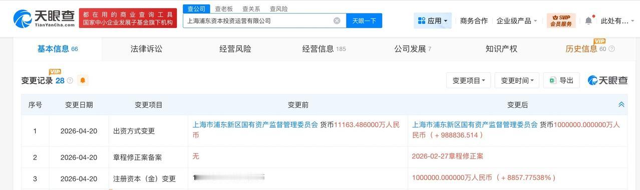 上海浦东资本投资运营公司增资至100亿 增幅约8858% 天眼查App显示,近日,上海浦东资本投资运营有限公司发生工商变更,注册资本由约1.1亿人民币增至100亿人民币,增幅约8858%。 该公司成立于2007年6月,法定代表人为罗芳艳,经营范围包括企业资产重组、购并策划及相关咨询服务,投资管理及咨询,由上海市浦东新区国有资产监督管理委员会全资持股。 天眼查信息: