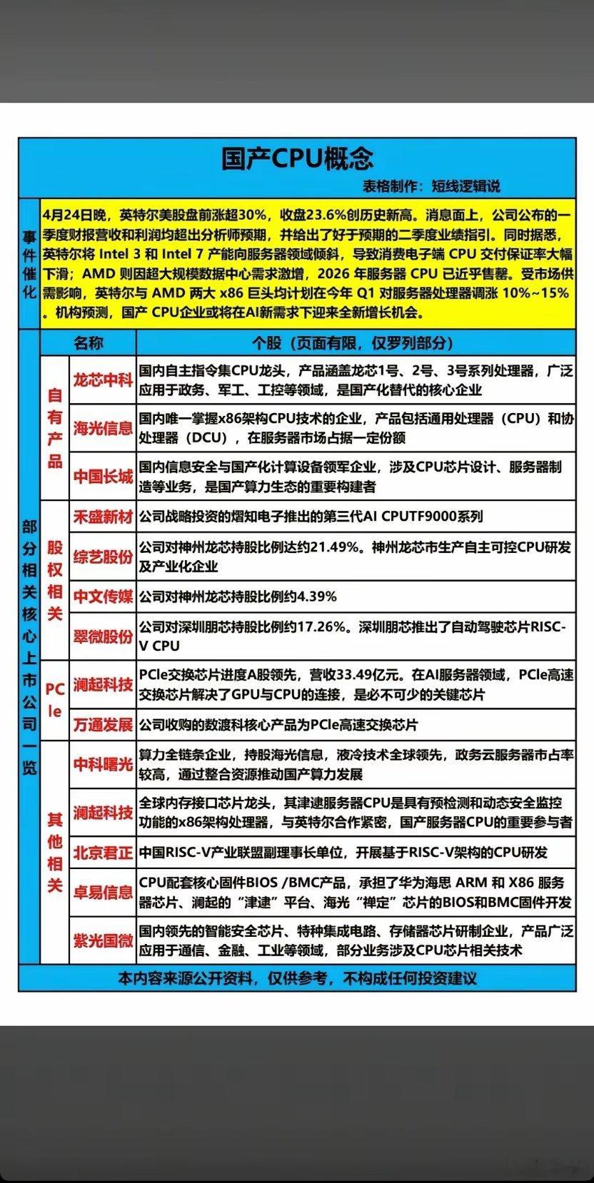 国产CPU概念迎风口!英特尔、AMD大动作,这些公司值得关注4月24日晚,英特尔美股盘前涨超30%,收盘涨23.6%创历史新高,背后是财报超预期+服务器产能倾斜;AMD也因数据中心需求激增,2026年服务器CPU近乎售罄。两大x86巨头计划Q1上调服务器处理器价格10%~15%,机构预测:国产CPU企业或在AI新需求下迎来全新增长机会!核心标的梳理:1. 自有产品:龙芯中科(自主指令集龙头)、海光信息(唯一掌握x86架构CPU技术)、中国长城(信息安全领军);2. 股权相关:综艺股份(持股神州龙芯21.49%)、中文传媒(持股神州龙芯4.39%)、翠微股份(持股深圳朋芯17.26%);3. PCIe相关:澜起科技(PCIe交换芯片A股领先)、万通发展(收购数渡科,核心产品PCIe高速交换芯片);4. 其他相关:中科曙光(算力全链条,持股海光信息)、北京君正(RISC-V架构研发)、卓易信息(CPU配套固件BIOS/BMC)、紫光国微(智能安全芯片涉及CPU技术)。国产替代加速,AI需求催化,这些公司值得关注!但投资需谨慎,内容仅供参考~(注:表格为公开资料整理,不构成投资建议)英特尔英特尔