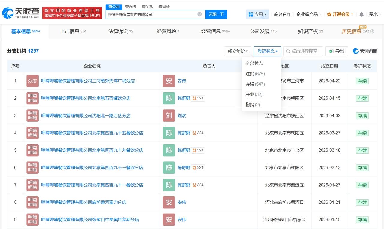 呷哺呷哺旗下超百家分支机构已注销 呷哺呷哺商业版图盘点呷哺呷哺5年亏15亿 据媒体报道,曾经以“一人一锅”平价模式风靡全国的呷哺呷哺,五年累计亏损超15亿元,市值蒸发超98%,如今股价跌至不足1港元沦为“仙股”,相关话题引发关注。 天眼查App显示,呷哺呷哺关联公司呷哺呷哺餐饮管理有限公司成立于2008年9月,法定代表人为刘欢,注册资本5500万人民币,经营范围包括餐饮服务、酒类经营、食品销售等,由呷哺呷哺投资集团有限公司全资持股。分支机构信息显示,该公司旗下超百家分支机构已注销。 天眼查信息:
