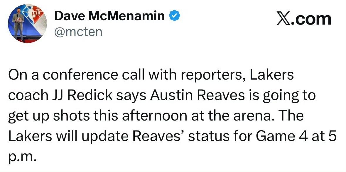 雷迪克在记者电话采访中表示:“里夫斯今日下午将前往球馆进行投篮训练。湖人将于下午五点更新里夫斯的G4出战状态。 ” 谈及布朗尼:“当初我们选中布朗尼时,我和勒布朗很早就达成了共识:我只会以布朗尼这名球员本身来执教他,而不会把他当作勒布朗的儿子来特殊对待。分清这两者的区别,这也是勒布朗想要的。” 谈及G3砍下5分的布朗尼:“教练组一直在用心培养布朗尼,我们对他的成长倍感欣慰。我清楚,勒布朗作为父亲,也为布朗尼过去两年的进步深感自豪,昨晚,是一段格外动人的时刻。” 湖人 洛杉矶湖人 篮球 NBA 布朗尼