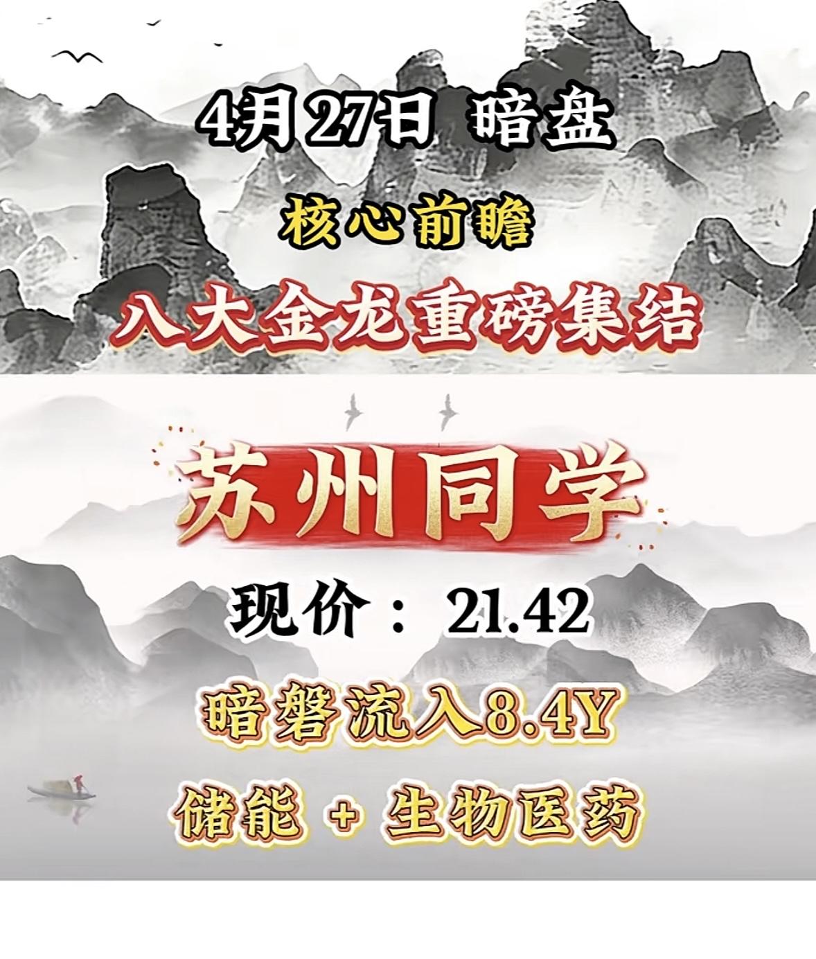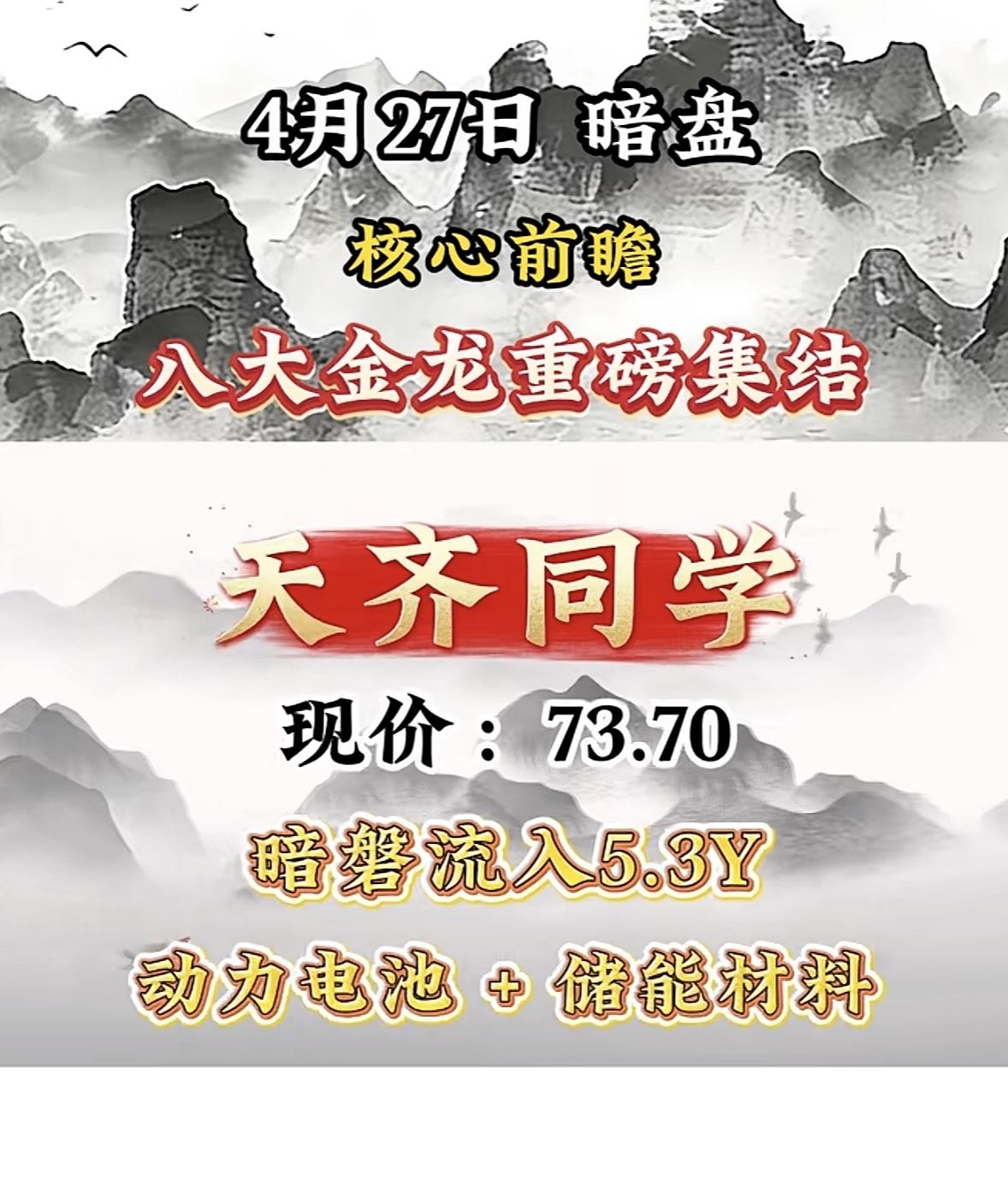 4月27日周一暗盘隔夜挂单排行榜揭晓 天齐同学在4月27日暗盘上隔夜挂单,这操作很有前瞻性啊!4月24日天齐锂业收盘73.70元,大涨8.43%,近一周累计上涨8.4%、近一月大涨21.52%,处于业绩爆增+资金回流+强势反弹格局。 从资金面看,4月24日主力资金净流入11.48亿元,特大单、大单同步净流入,做多动能强劲。技术面也呈现强势突破反弹。综合研判,下周震荡偏强概率55%、上涨概率30%,核心区间71 - 78元,站稳75元有望冲击80元。天齐锂业潜力无限,值得持续关注!