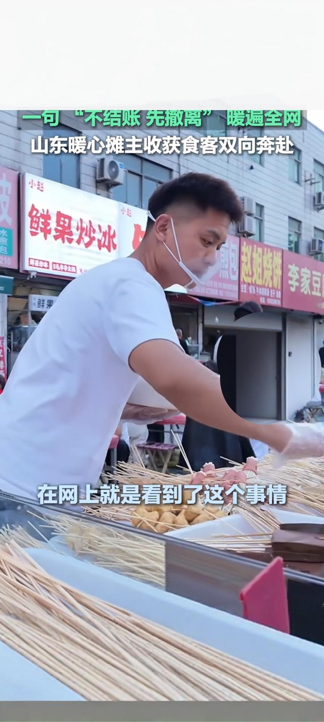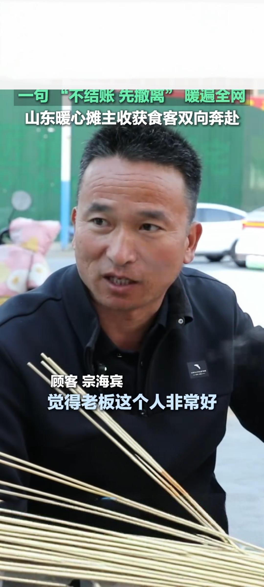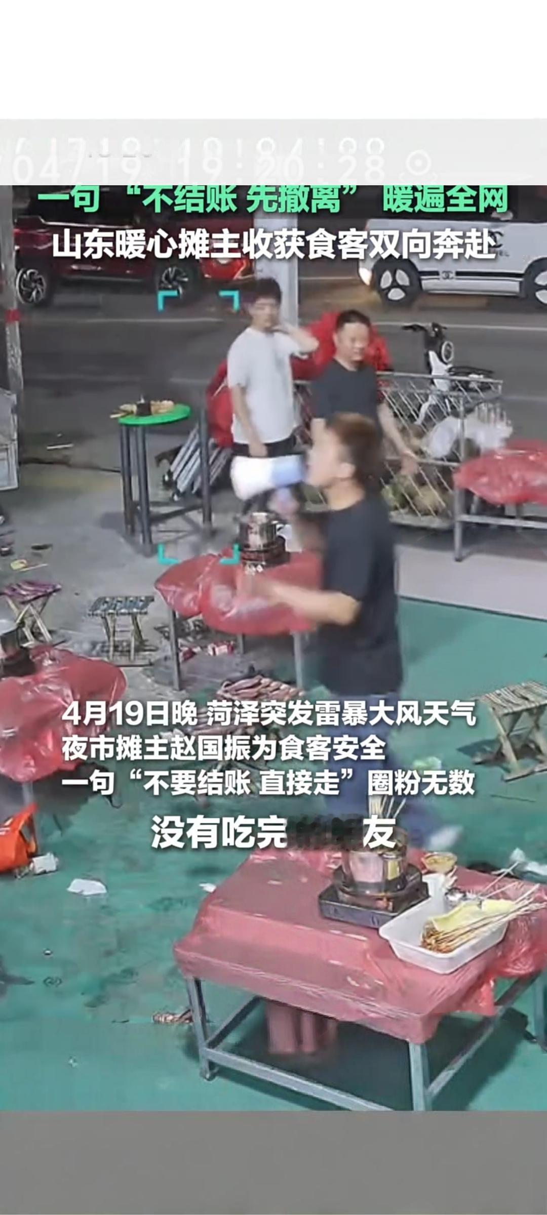 山东摊主一句“不结账先撤离”暖遍全网 平凡善举彰显人间大爱 近日,山东菏泽一则“摊主狂风中喊顾客免单撤离”的短视频在快手等平台刷屏,播放量超7.1万次,一句质朴喊话温暖无数网友,上演暖心双向奔赴 。 4月19日晚,山东菏泽东明县突遭雷暴大风天气,夜市瞬间狂风大作、杂物横飞,现场秩序混乱 。摊主赵国振的串串摊位前约40桌食客正用餐,其中不乏老人与孩子,安全风险陡增 。危急时刻,赵国振不顾摊位与食材损失,拿起喇叭大声喊话:“没吃完不用结账,赶紧撤离,确保安全!” 。他放弃当晚经营收入,引导食客有序疏散,短短几分钟内所有人安全离开,无一人受伤 。 狂风过后,赵国振摊位设施损毁、食材散落,直接经济损失数千元,但他表示,安全比金钱更重要 。此事经网络传播后迅速走红,众多市民与网友被这份善良打动。次日不少食客专程返回补结账,均被赵国振婉拒。网友纷纷点赞,称其“格局大、心地善”,朴实举动彰显普通人的责任与担当。 这场突发风雨里,摊主舍小利护平安,食客懂感恩返补款,双向善意汇聚成暖流,展现了平凡生活中的人性光辉,传递出向上向善的社会正能量 。 摊主喊话 平凡善举 传递正能量
